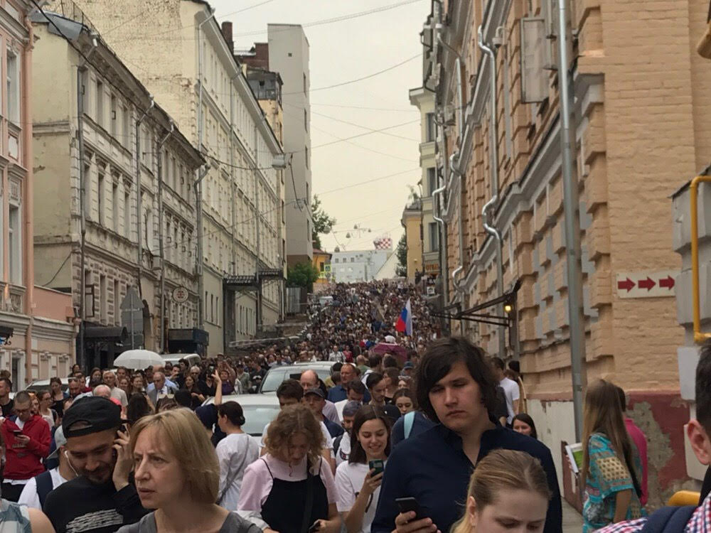 Марш дошел до Петровки, но пройти дальше не получается. Милиция просит людей сворачивать в соседние переулки, они сворачивают, передает корреспондент The Bell. По данным "Медузы", полиция забирает участников марша на подходе к Петровке.