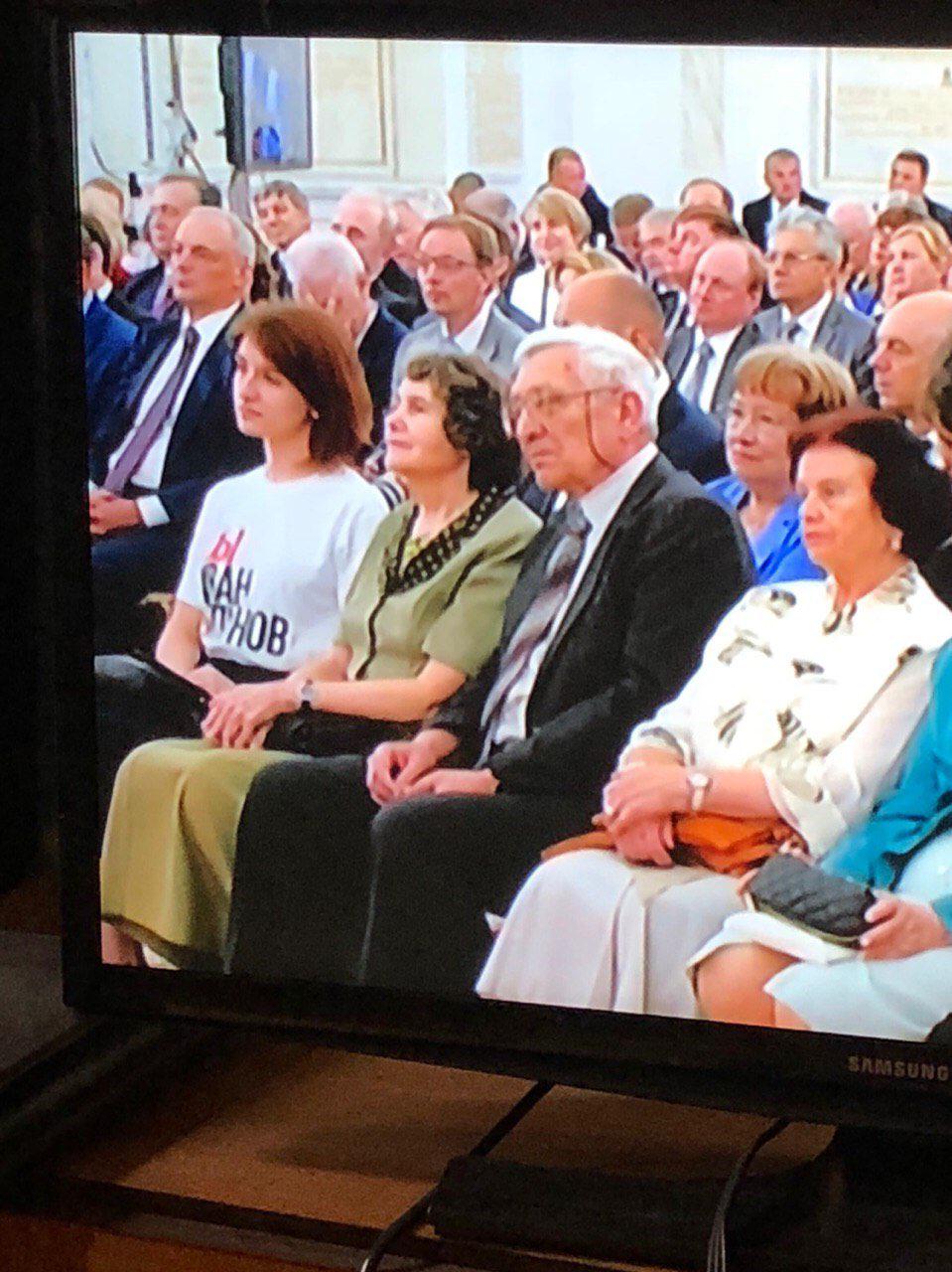 Зато на приеме в Кремле по случаю Дня России сегодня была вот такая девушка, заметил The Bell. Нам рассказывают, что операторы усиленно старались, чтобы она не попадала в кадр.