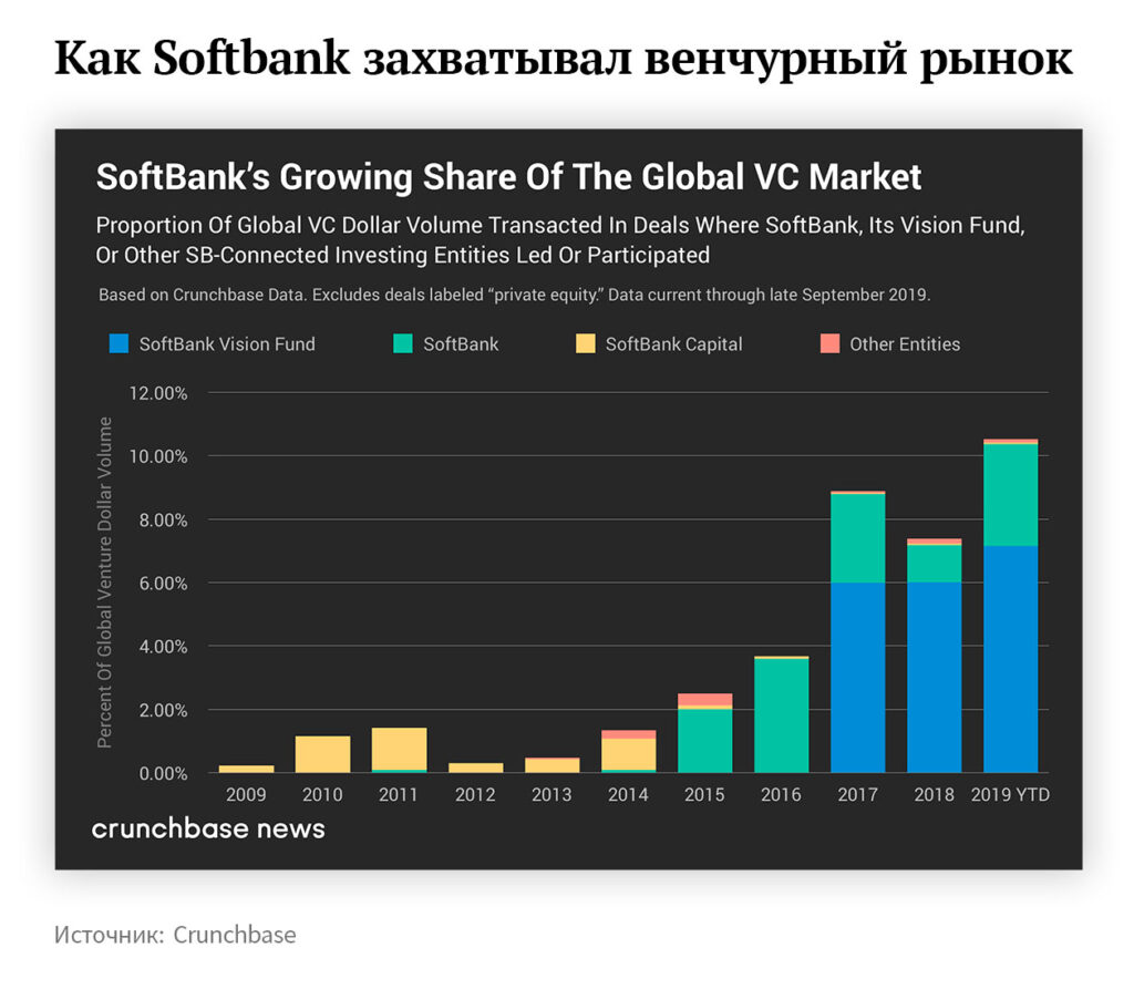 Тон задавали Softbank Vision Fund и его соинвесторы. Вместе они сделали 10% общего объема венчурных инвестиций.