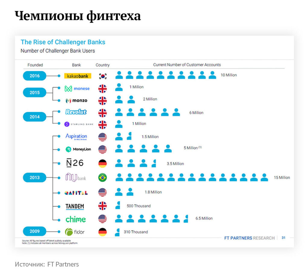 Последние несколько лет финтех привлекает больше всего инвестиций среди всех секторов. По оценке CB Insights и KPMG, за первые 9 месяцев 2019 года доля составила 15%. Необанки появляются на всех континентах и завоевывают миллионы пользователей.