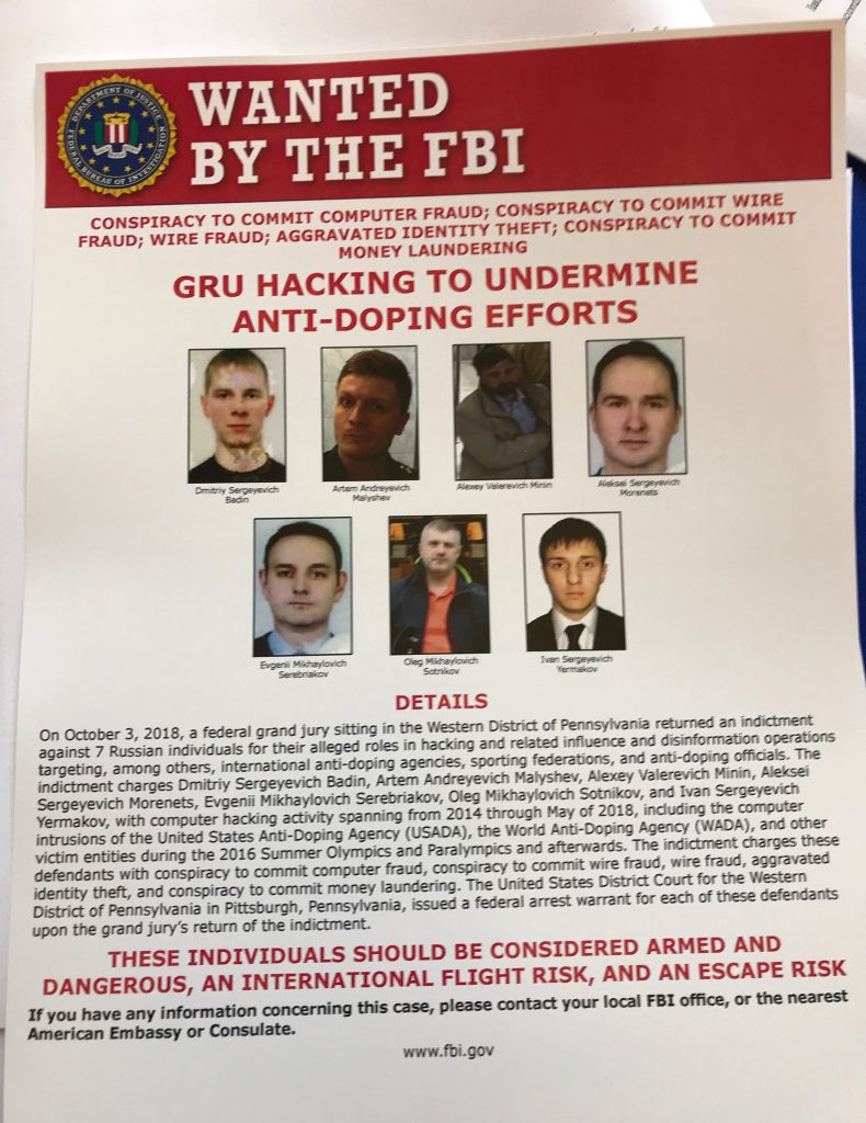 Минюст США предъявил обвинения в кибератаках на международные спортивные организации, в том числе WADA и FIFA, семи сотрудникам ГРУ. Каждому предъявлены обвинения в заговоре с целью мошенничества, а также в заговоре с целью мошенничества с использованием электронных средств общения и отмывания денежных средств. Максимальное наказание за эти преступления — 20 лет тюрьмы.