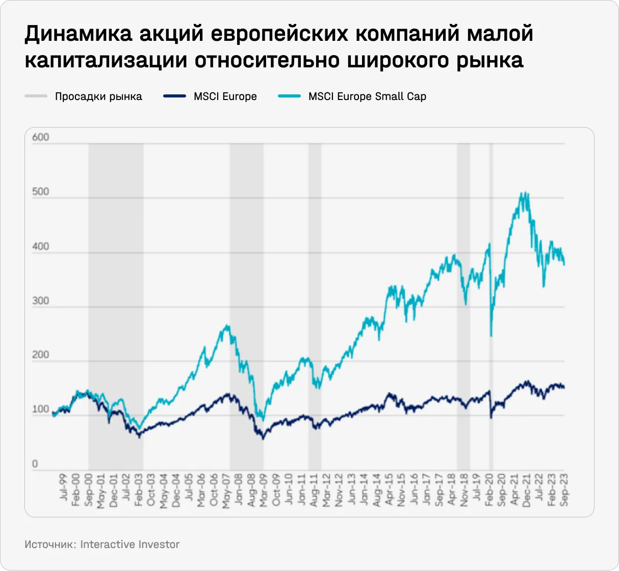 При этом компании малой капитализации не пользуются такой популярностью и отстают от широкого рынка (см. график ниже). Взвешенный по капитализации индекс MSCI Europe Small Cap потерял 26,9% по итогам 2022 года — и продолжает падать. Для сравнения, глобальный индекс MSCI World Small Cap в 2022-м упал на 18,4%. Все это связано с тем, что небольшие компании считаются более рискованными и распродаются инвесторами, когда настроения на рынке ухудшаются. В последние годы пандемия, боевые действия в Украине и проблемы в экономике Китая сильнее ударили по Европе. В третьем квартале экономика еврозоны сократилась на 0,1%.
