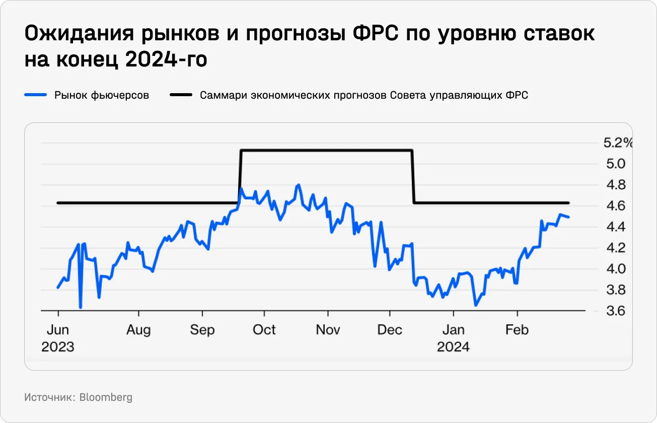 Рынки уже капитулировали перед ФРС: если в какой-то момент они ожидали шесть снижений ставок в 2024-м (на 150 б. п.), то теперь эти ожидания уменьшились до 3 шагов (80 б. п.). Это уже очень близко к медианному прогнозу чиновников ФРС (75 б. п.). Кроме того, ожидания первого снижения сместились с марта на июнь.