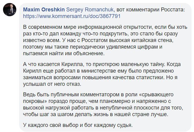 Дальше спор круто свернул в сторону. Министр Максим Орешкин прокомментировал последний пост Тремасова историей о том, как в момент увольнения экономиста из министерства в 2017 году предложил ему заняться повышением качества статистики в структуре Минэка, но Тремасов ответил отказом.
