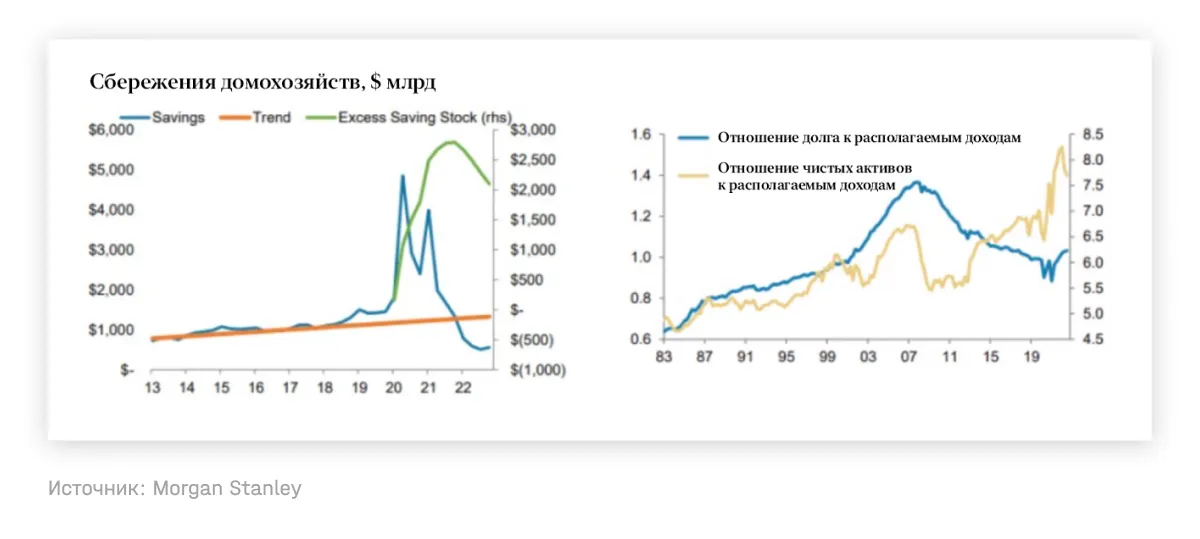 2. Потребители останутся в хорошей форме: домохозяйства располагают большими, чем обычно на текущей стадии экономического цикла, запасами денежных средств благодаря стимулирующим выплатам и сокращению расходов из-за пандемии. Хотя сейчас эти запасы сокращаются, отношение чистых активов домохозяйств к располагаемому доходу остается повышенным по историческим меркам, а отношение долга к располагаемым доходам — низким.