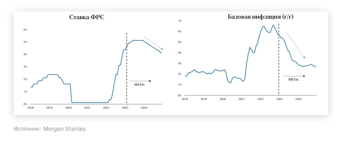 1. Денежно-кредитная политика будет более «мягкой» по мере замедления темпов инфляции (это будет учитываться в ожиданиях рынков). В MS ждут сохранения только начавшегося тренда на замедление инфляции — к середине 2024 года базовая инфляция должна замедлиться с текущих 5,6% до 2,8%. В прогнозе MS не заложена инфляция, но если она случится, то ФРС придется быть еще более сговорчивой.