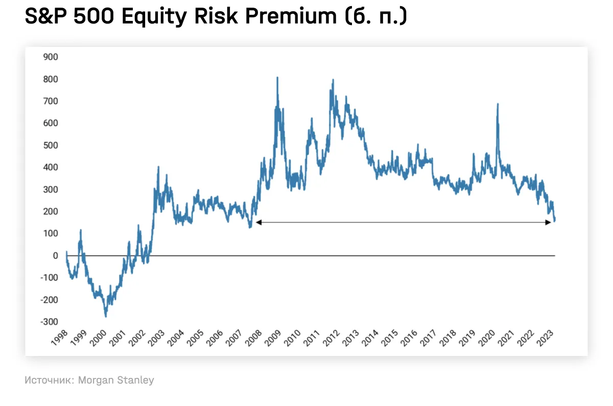 1. Премия за риск по акциям (ERP) должна превысить 350 базисных пунктов (б. п.) — справедливого, по оценке MS, уровня. Это соответствует средним историческим уровням: в последние два десятилетия ERP в основном колебалась в диапазоне 300–350 б. п.