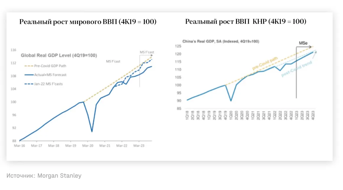 3. Восстановление глобального экономического роста, в том числе в экономиках, которые до конца еще не оправились от локдаунов, и прежде всего Китая. Аналитики MS отмечают в качестве одного из драйверов роста в КНР более ориентированную на рост политику властей. В последние месяцы власти послали несколько позитивных сигналов бизнесу. При этом рост в КНР и мире все еще отстает от доковидного тренда.