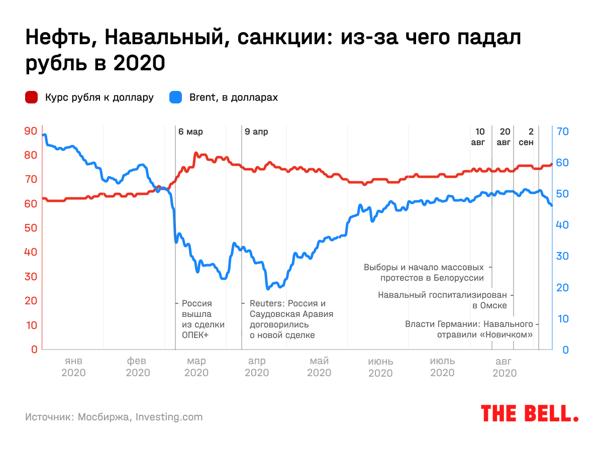 • Российская валюта оказалась под давлением сразу нескольких негативных факторов. Помимо цен на нефть (напомним, при цене ниже цены отсечения бюджетного правила — $42,4 — она оказывает намного больше влияния на курс рубля), это рост геополитических рисков из-за отравления Алексея Навального и решение ЦБ не продавать всю валюту, которой правительство оплатило контрольный пакет Сбербанка, говорят опрошенные The Bell аналитики.