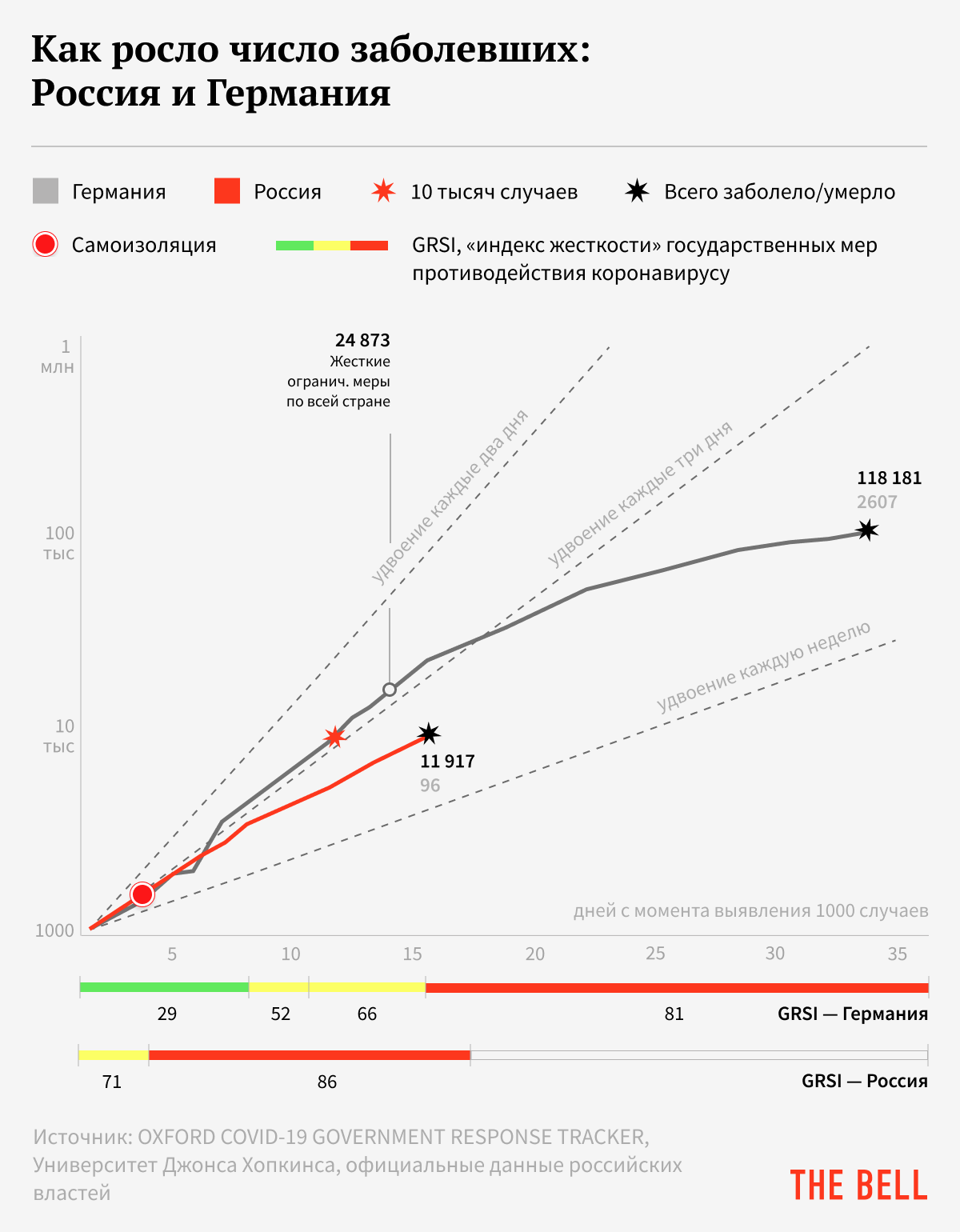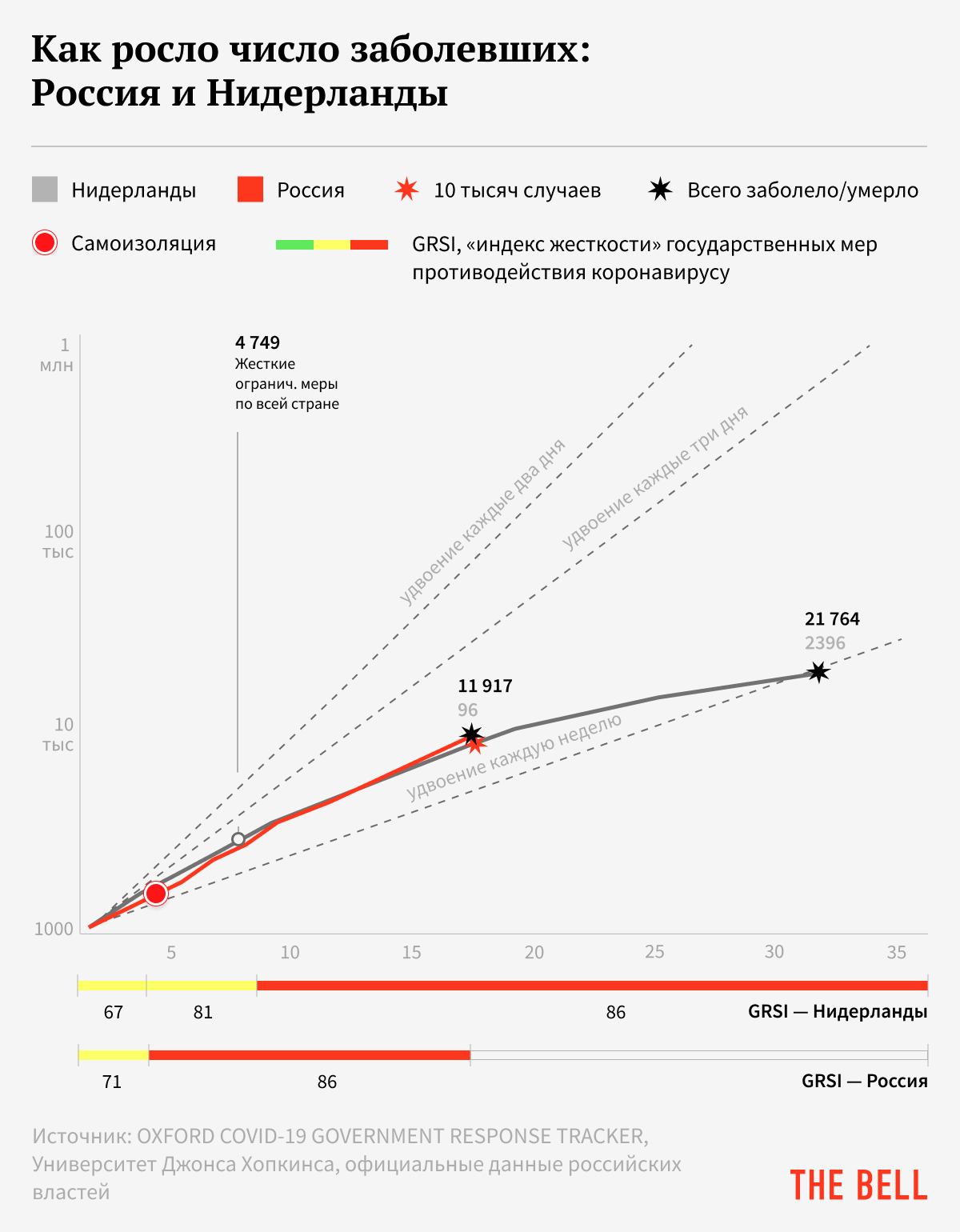 Отсчет во всех графиках начинается со дня, когда число заболевших в каждой стране превысило тысячу. Помимо числа заболевших мы нанесли на них даты введения карантинных мер и оценку их жесткости, которую проводит Школа управления Блаватника при Оксфордском университете, по стобалльной шкале, где 0 — полное отсутствие ограничений, а 100 — максимальный их уровень. Для наглядности на графике пунктиром показаны три образцовых линии экспоненциального роста: удвоение числа заболевших каждую неделю, каждые три дня и каждые два дня.