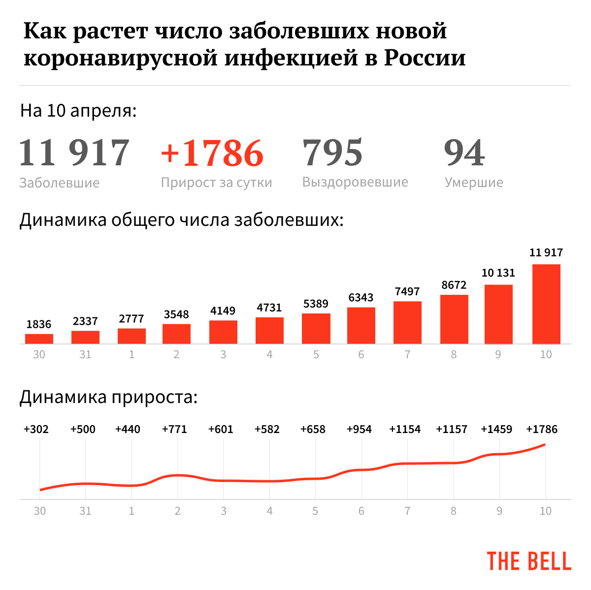 Число заболевших в России превысило 10 тысяч в четверг, 9 апреля. В пятницу эта цифра выросла сразу на 1786 человек, до 11 917. Более 1000 заболевших за сутки было впервые зафиксировано в Москве. «Когда говорят, что вот вроде бы пик наступил. Я вам точно говорю, никакого пика еще не наступило», — предупредил в пятницу мэр Москвы Сергей Собянин.