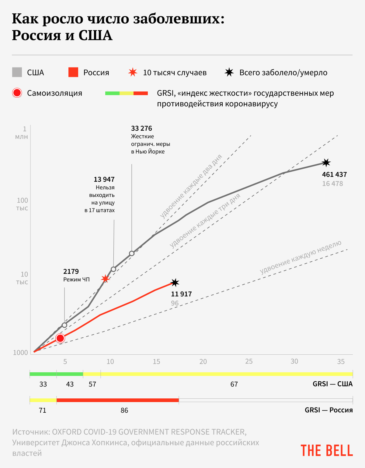 Из графика видно, что динамика в США была с самого начала хуже российской, а карантинные меры — мягче. Дональд Трамп сперва заявлял, что вирус просто исчезнет, потом — что если от коронавируса умрет 100 тысяч американцев, это будет «очень хорошим результатом». США очень рано, с 1 февраля, ввели запрет на въезд для иностранцев, посещавших Китай, но слишком поздно начали массовое тестирование и не вводили серьезных карантинных мер до 16 марта, когда число заболевших уже приближалось к 5 тысячам. Оксфордский индекс в США и сейчас ниже, чем в России, на 15 пунктов.