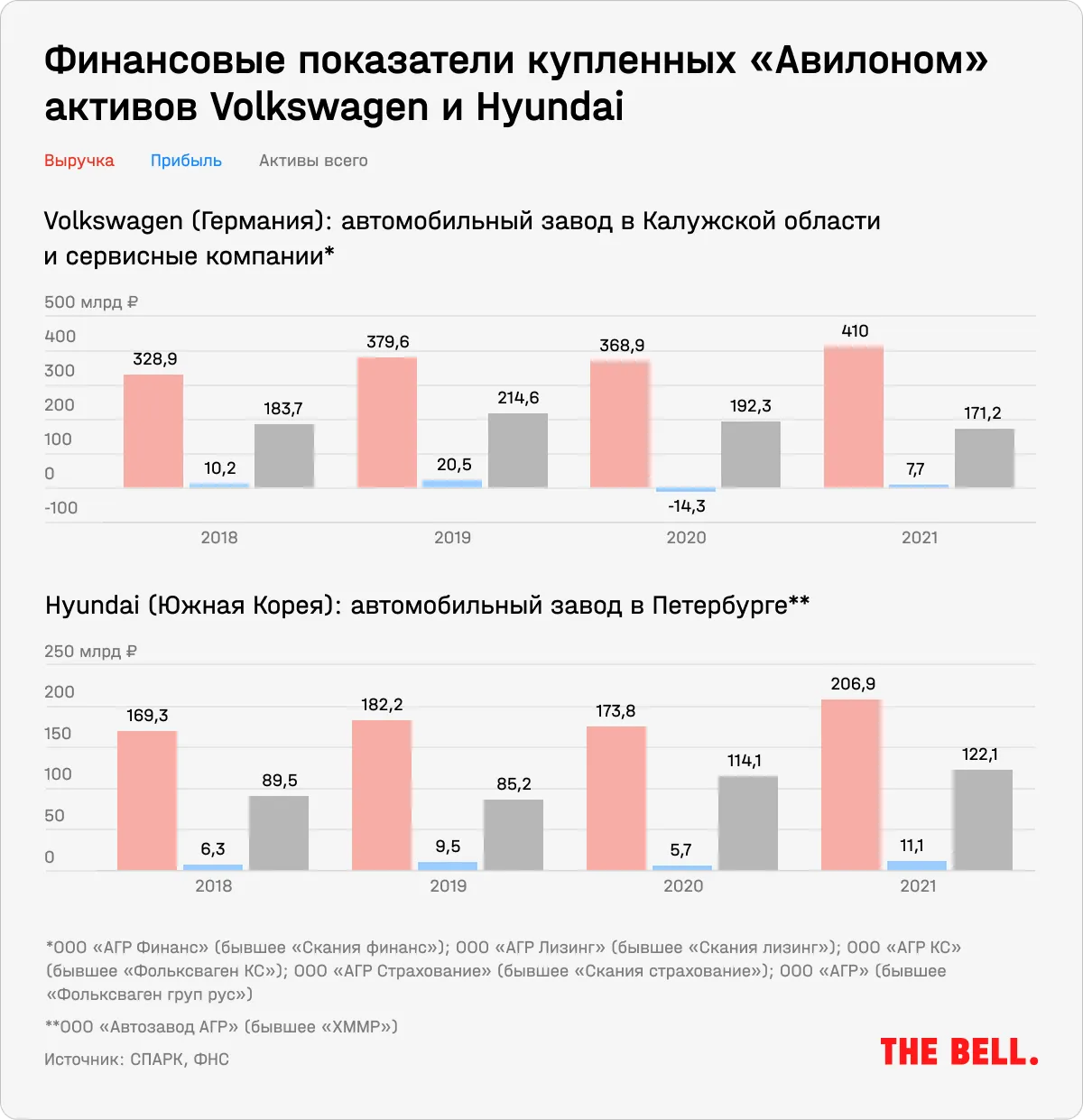 На этом «Арт-Финанс» не остановился. В декабре 2023 года компания стала собственником автозавода южнокорейской Hyundai в Петербурге, производившего автомобили Hyundai и Kia и также остановившего производство сразу после начала войны. Корейцы до войны занимали на российском рынке вдвое большую долю, чем Volkswagen — в 2021 году в стране было продано 372 тысячи Hyundai и Kia (22,3% рынка в количественном выражении). Часть машин, правда, собиралась на независимом калининградском заводе Производственная мощность петербургского завода составляет «Автотор». Но большая часть приходилась на собственное предприятие Hyundai — его мощность составляла 230 тысяч машин в год. Выручка российского юрлица Hyundai составляла 206 млрд рублей, чистая прибыль — более 11 млрд рублей, стоимость активов — 122 млрд рублей. Чистый долг компании был почти нулевым.
