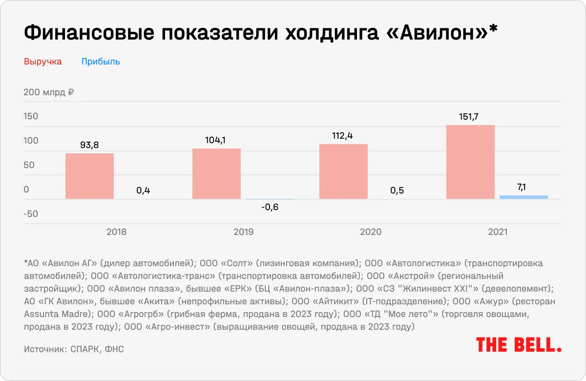 Сами «Авилон» и «Солт» с 2022 года тоже перестали публиковать свою отчетность. В 2020 году они отражали совокупную выручку 92,5 млрд рублей, чистую прибыль — около 2,3 млрд рублей, в 2021-м — 131,5 млрд рублей и 7,2 млрд рублей соответственно.