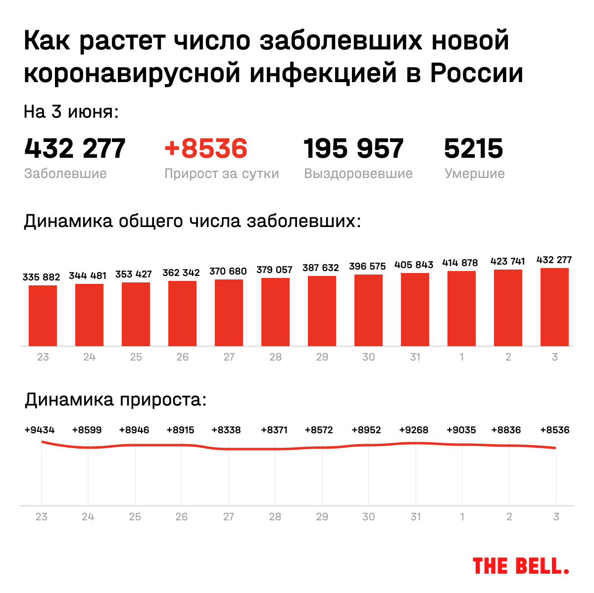 В России число новых выявленных случаев заражения коронавирусом уже примерно две недели держится на одном уровне: за последние сутки — 8831, общее число превысило 441 тысячу. Умерли от коронавируса, по официальной статистике, 5384 человека (+169 за сутки).