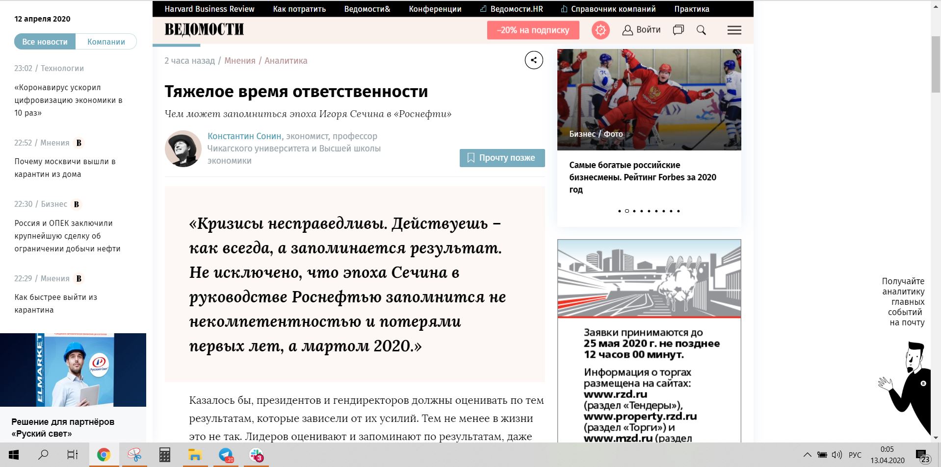 Сонин вспоминает предполагаемую роль «Роснефти» в обвале рубля в декабре 2014 года и инвестиции компании в нефтяные проекты в Венесуэле, которые в марте пришлось выкупить российскому государству. «Запомнятся не 10 лет бессмысленных трат на “повышение геополитической роли”, а малопонятная передача активов в 2020 году. Потому что в тяжелых обстоятельствах граждане внимательнее следят за государственным кошельком. Кризисы несправедливы. Действуешь как всегда, а запоминается результат», — пишет экономист.