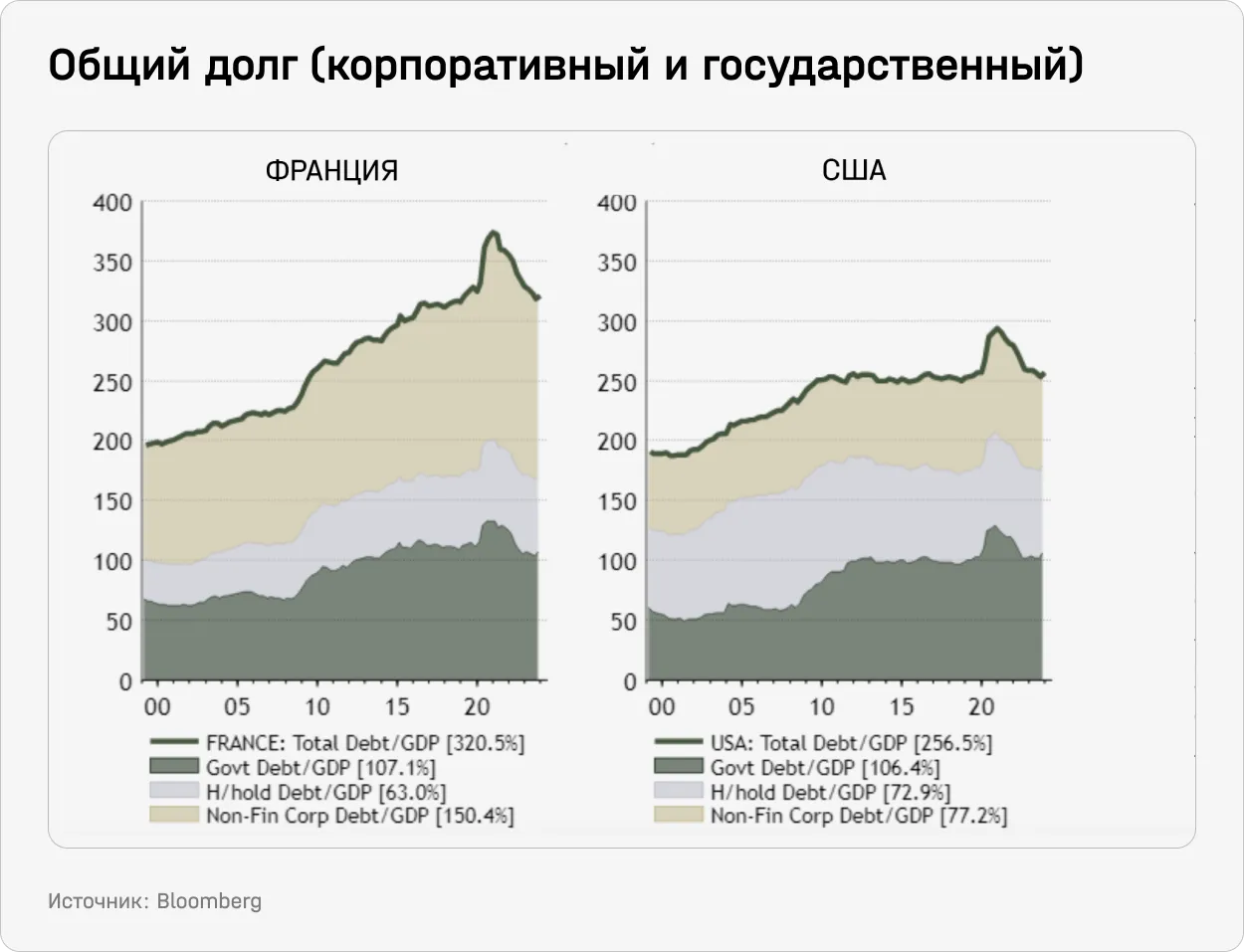 Крупные инвесторы, в том числе Franklin Templeton, LGIM и Vanguard, еще до выборов в Европарламент рекомендовали продавать французский госдолг из-за роста дефицита: в апреле правительство Франции уже подняло таргет по нему с 4,4% до 5,1% ВВП. Агентство Fitch еще в прошлом году понизило кредитный рейтинг Франции, в конце мая это же сделало S&P, а 11 июня агентство Moody’s заявило о негативном влиянии предстоящих выборов на суверенный рейтинг, который пока еще находится на уровне Aa2, на один шаг выше Fitch и S&P. Moody’s подчеркнуло, что уровень госдолга Франции, который уже превышает 110% ВВП, выше, чем у других стран с аналогичным рейтингом, и практически непрерывно увеличивается с 1970-х годов из-за постоянного большого структурного дефицита бюджета.