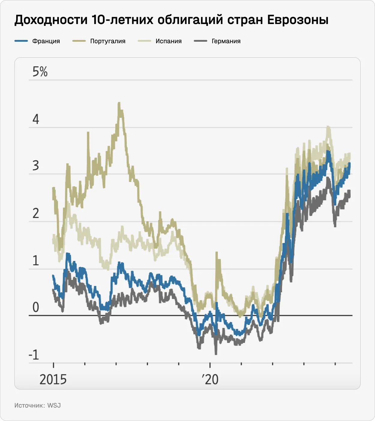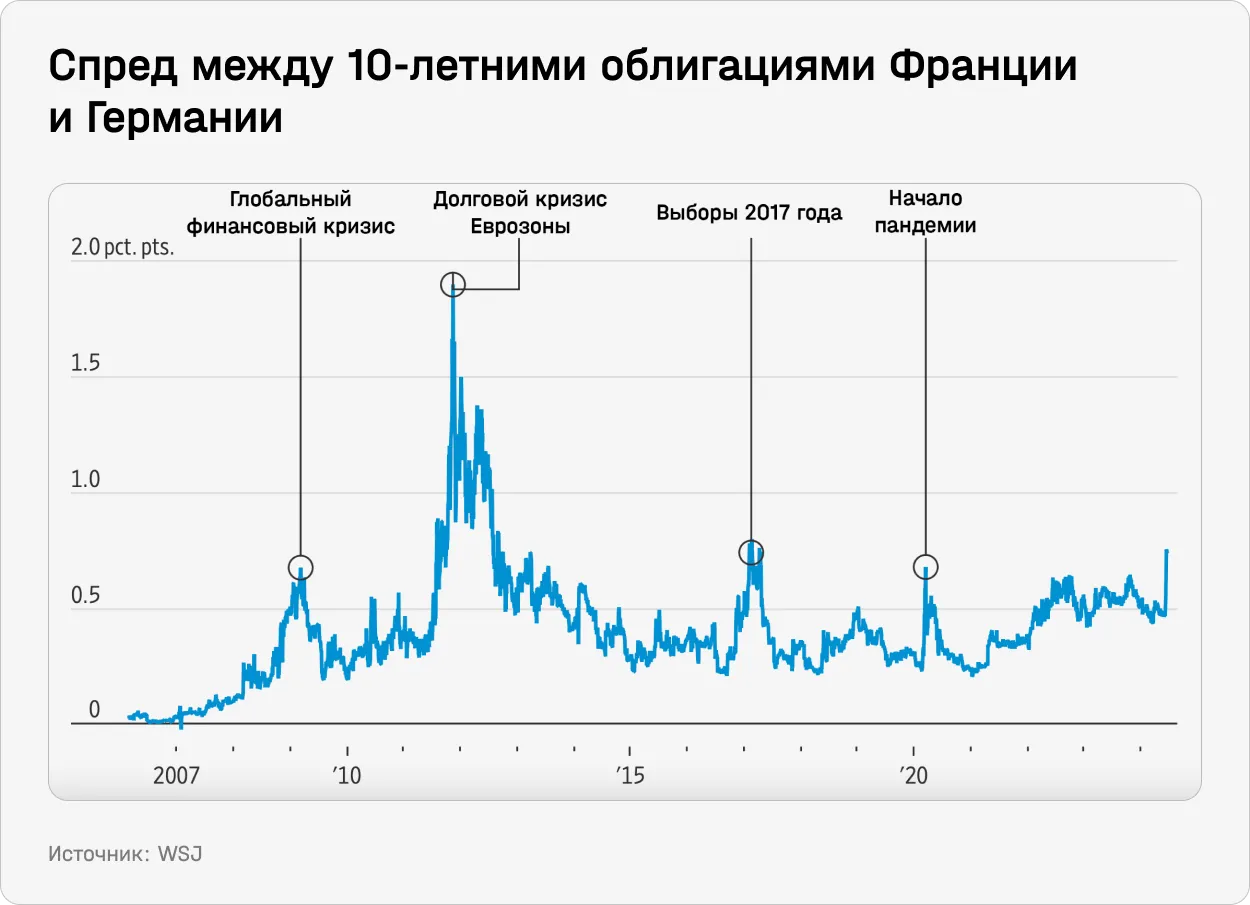 Сильнее всего пострадал банковский сектор — с большим отрывом крупнейший в Европе. Французские банки падали почти каждый день на прошлой неделе: Societe Generale потерял почти 15%, Credit Agricole, BNP Paribas — примерно по 12%. Банки — крупные держатели французских суверенных облигаций. Их акции также подверглись распродаже, напомнив рынкам о риске долгового кризиса наподобие того, что был в 2011–2012 годах, отмечает WSJ.