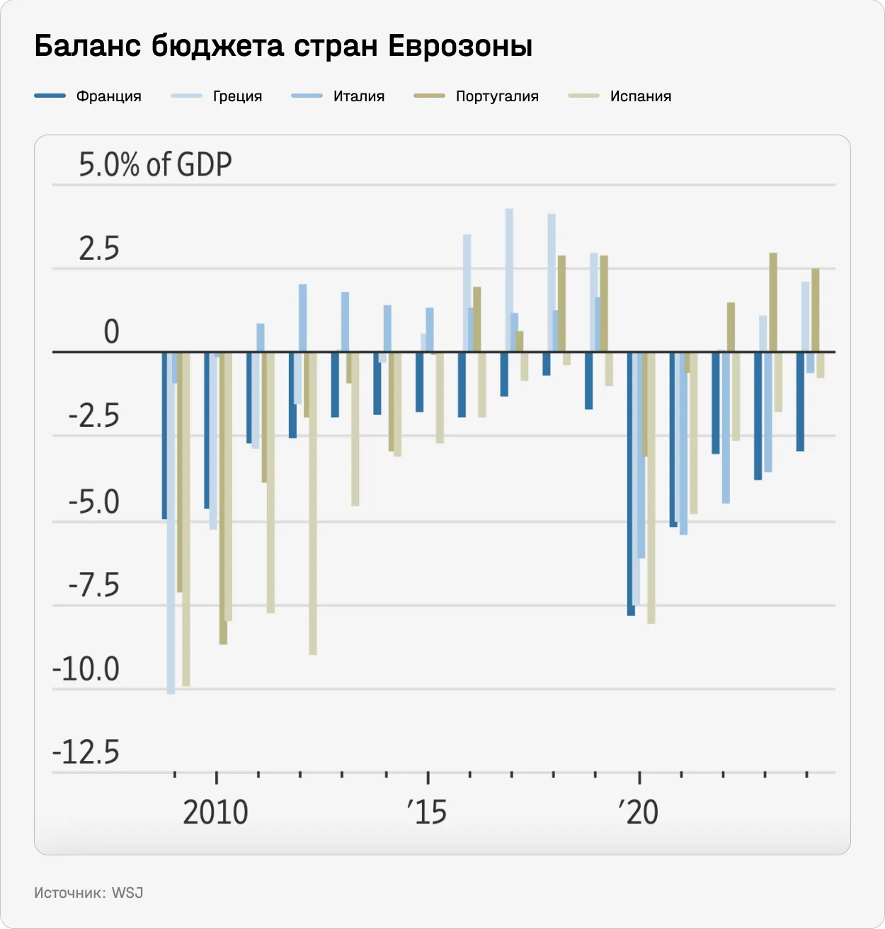 Ситуация с дефицитом бюджета давно способствует тому, что Франция оценивается долговыми рынками почти как страны Южной Европы. Ставки по 10-летним облигациям Франции сейчас находятся примерно на том же уровне, что и у этих стран.