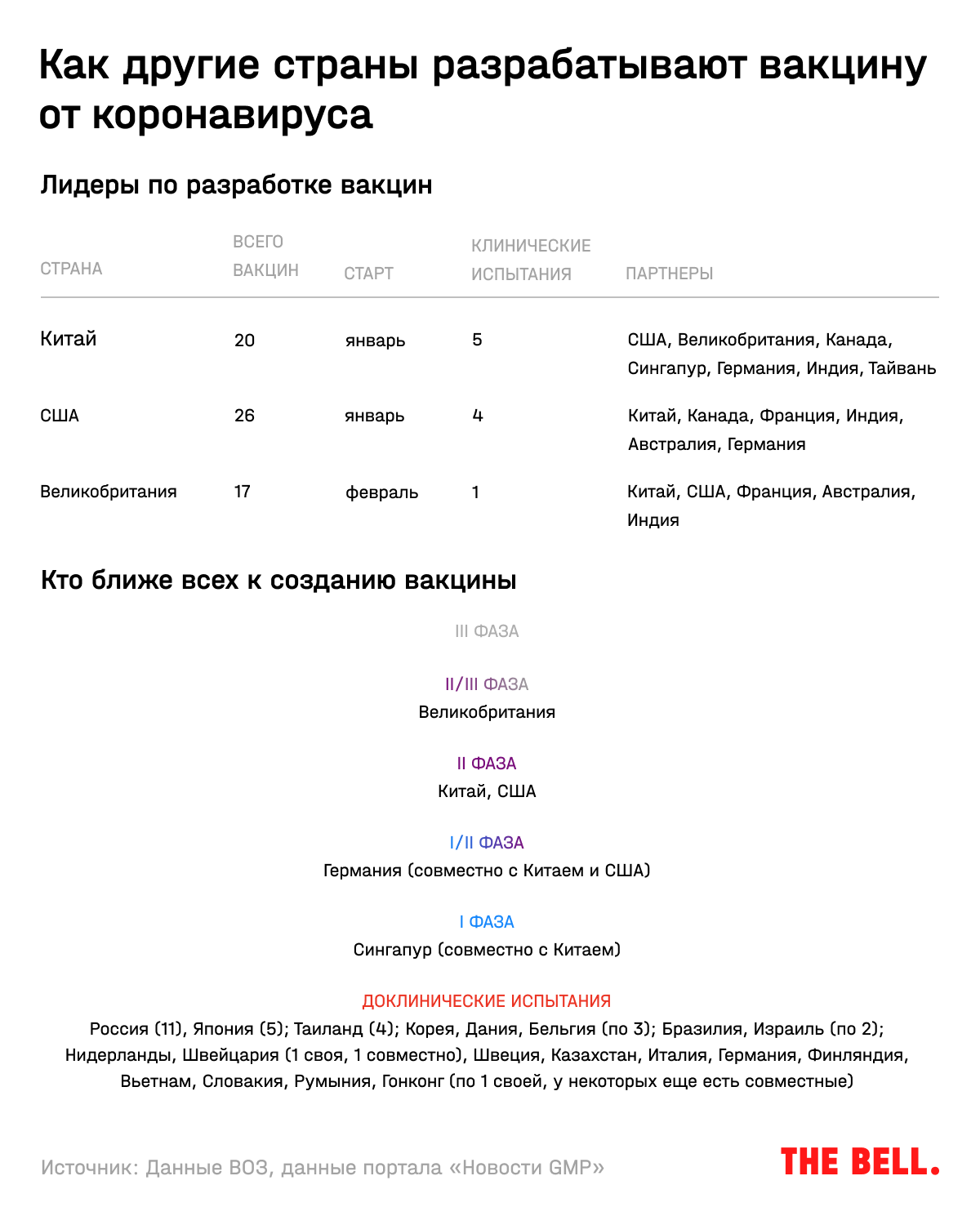 Лидеры по разработке вакцин — Китай, США и Великобритания: у них больше всего субстанций в списке ВОЗ, которые дошли до клинических испытаний (под стартом в таблице выше имеется в виду начало работы над первой вакциной в стране). Дальше всех продвинулась британская компания AstraZeneca совместно с Оксфордским университетом. Их вакцина уже на II/III фазе испытаний (всего их три).