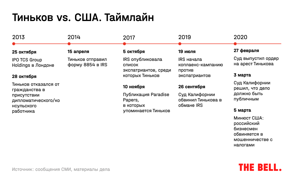 Тиньков отказался от гражданства США 28 октября 2013 года в присутствии консульского работника. В документах для выхода он указал, что его годовой доход — $206 000, состояние — $300 000 (эти детали перечислены в материалах суда). На самом деле к этому моменту Тиньков уже был долларовым миллиардером: за три дня до выхода из гражданства TCS Group, головная компании Тинькофф банка, провела успешное IPO в Лондоне. «Тинькофф» оценили в немыслимые для российского банка шесть капиталов. Тиньков на тот момент владел через свои структуры на BVI пакетом стоимостью минимум $1 млрд, пишет минюст США. Тем не менее даже через полгода Тиньков подписал заявление об экспатриации и форму для возврата налогов в США с указанием все той же суммы своего дохода — $206 000.