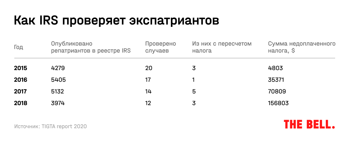 В 2017 году из всех перечисленных в реестре IRS экспатриантов на уплату налогов проверили только 14 человек, или меньше 1%, следует из отчета главной инспекции по администрированию налогов (TIGDA). При этом в 35% случаев экспатрианты недоплатили налог.