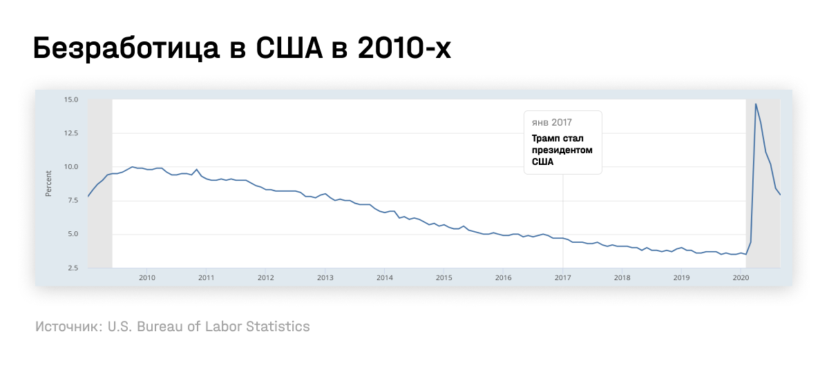 Когда президентом стал Трамп, он быстро вернулся к темпам, которыми рос при Обаме, — то есть приход Трампа воспринимался как позитивный сигнал. Налоговая реформа тоже подстегнула рост рынка, хотя дала ли она что-то экономическому росту в целом — большой вопрос. Если вы сравните графики темпов экономического роста и безработицы за последние семь лет, вы не сможете отследить, в какой момент Трамп стал президентом. То же самое можно сказать и о президентстве Обамы. С другой стороны, был президент, при нем был рост — на что жаловаться?