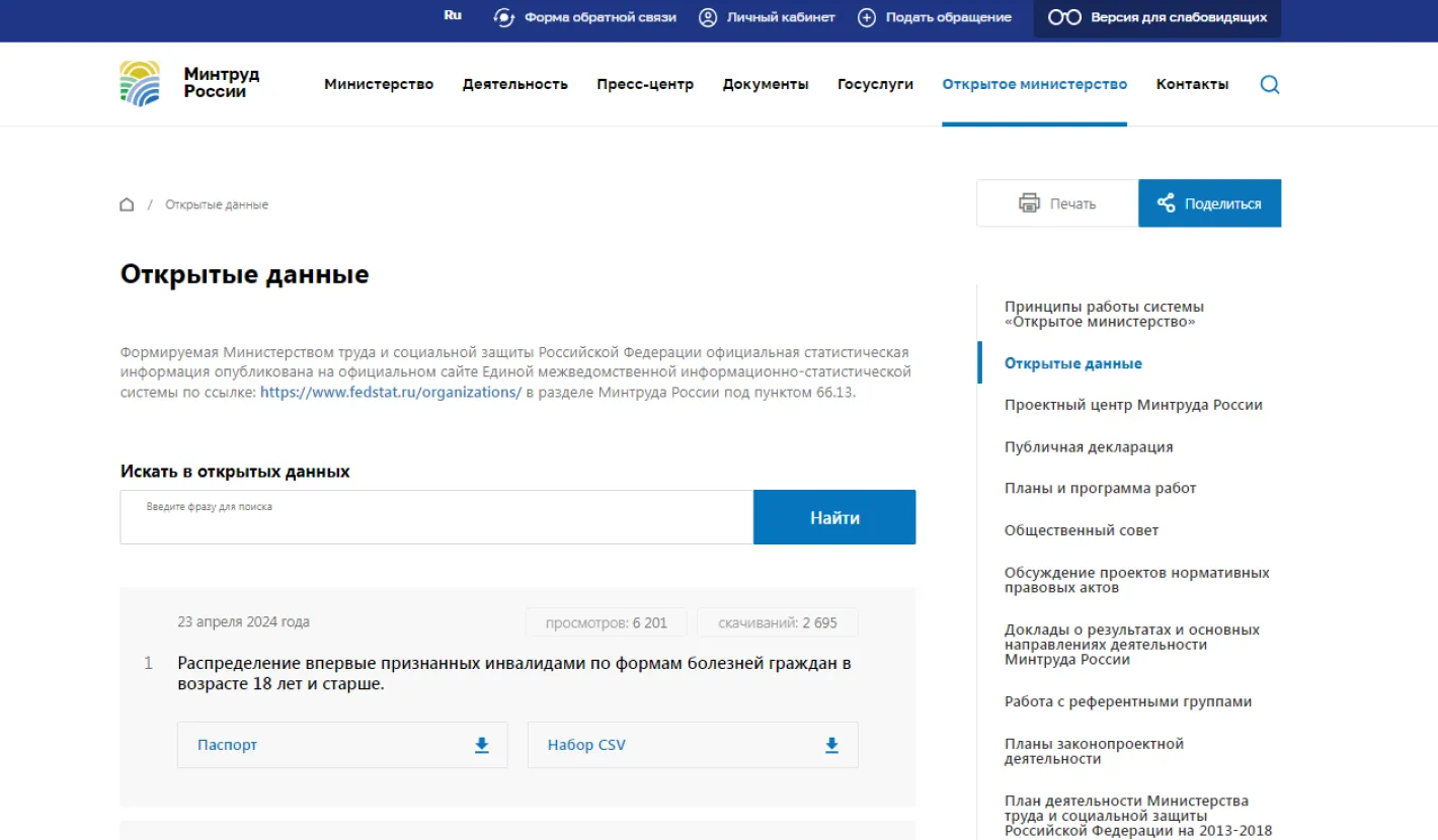 Нужные нам данные об инвалидности нашлись в разделе «Открытые данные» на сайте Минтруда.