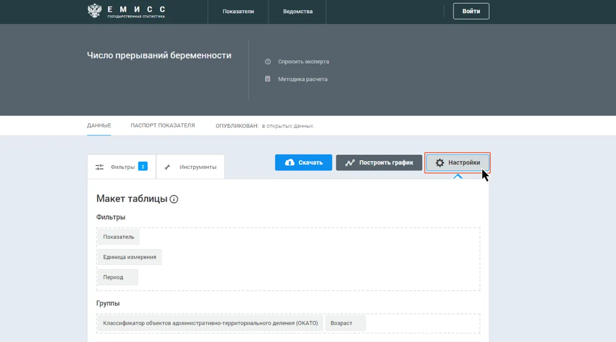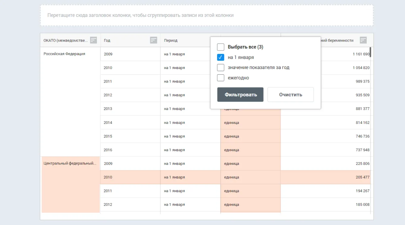Например, в фильтре «период» может встречаться разное написание одного и того же значения, которые использовались в разные годы: например, «на 1 января», «значение показателя за год», «ежегодно». Вы получите данные за весь доступный период, только выбрав все три значения.