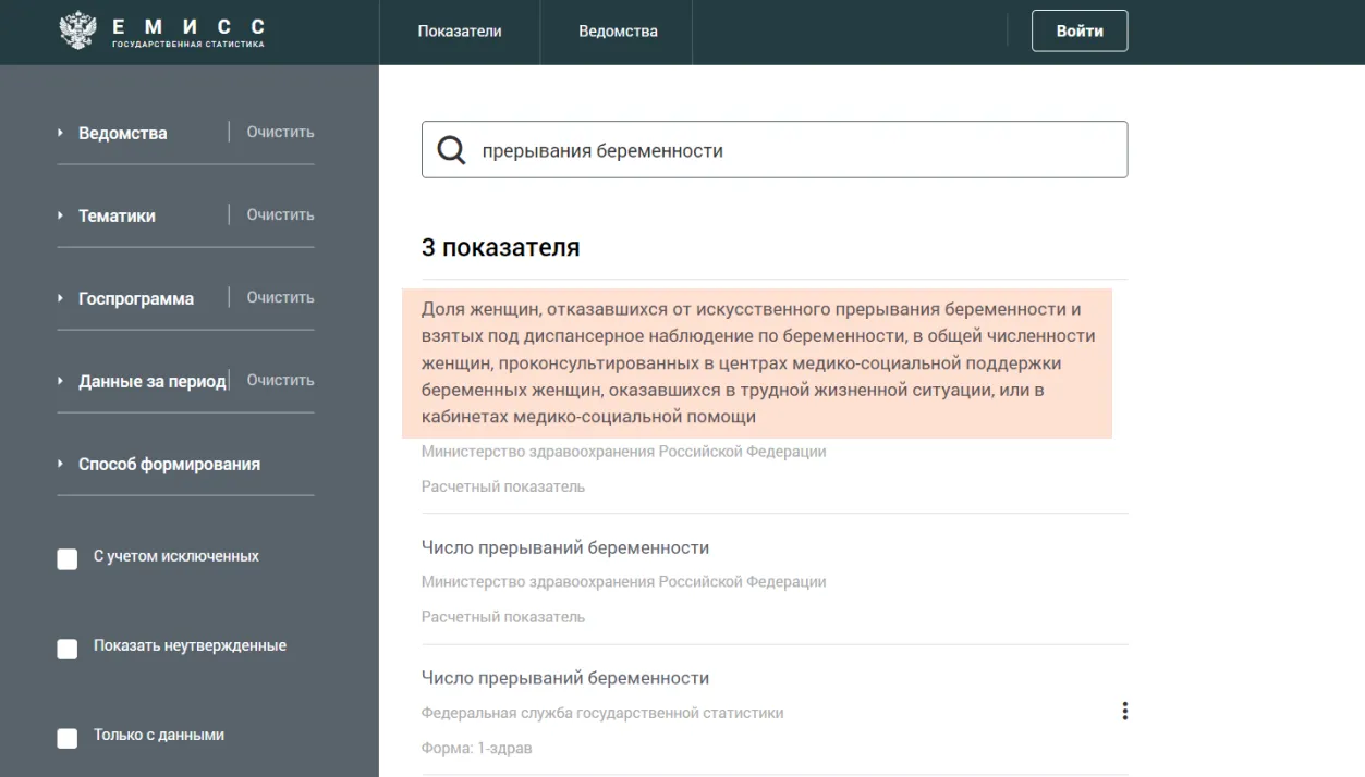 Важно: поиск работает только по точным вхождениям. Например, по запросу «аборт» результатов не будет, запрос «прерывание беременности» покажет два датасета, а «прерывания беременности» — три.