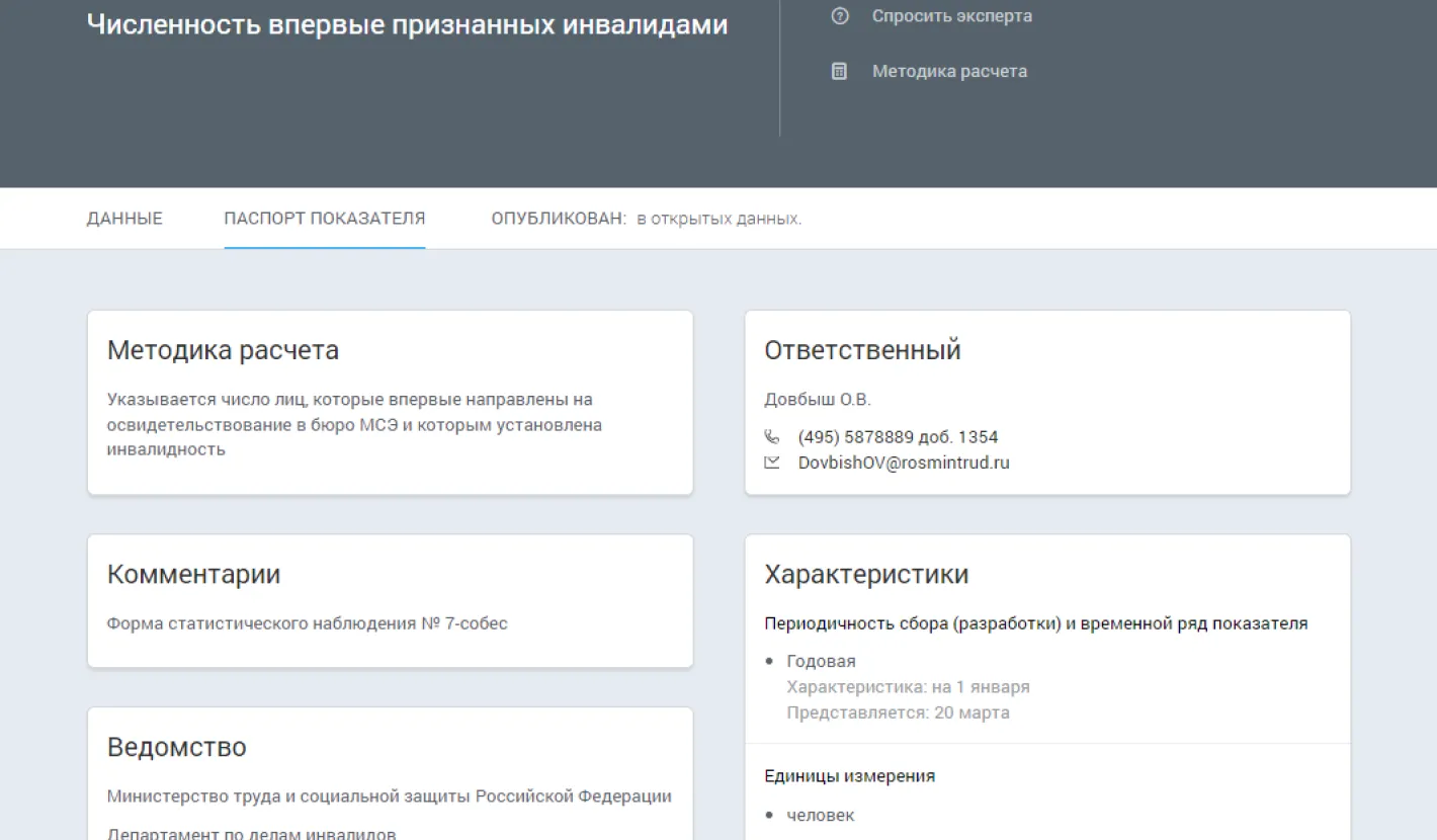 Например, мы хотим узнать, сколько людей в 2023 году получили инвалидность из-за заболеваний глаз в разрезе регионов. На ЕМИСС есть нужный показатель, но данные там только за 2017 год. Но во вкладке «паспорт показателя» указано, что данные собирает Минтруд.