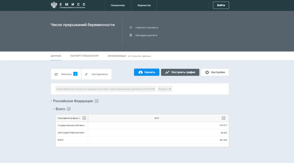 Например, датасет Росстата по абортам содержит разрезы по регионам, возрастам, форме собственности клиники. А форма 1-Здрав содержит разрезы по сроку беременности, виду аборта (самопроизвольный, медицинский, медикаментозный), наличию ВИЧ-статуса у беременной.