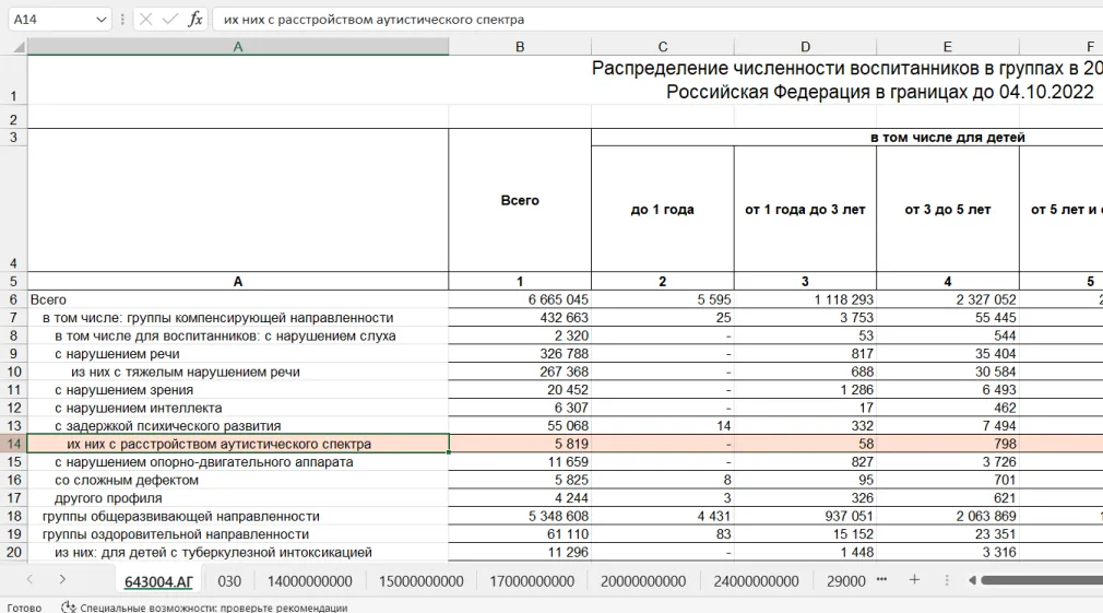 И там, и там есть данные о детях с РАС — количество групп, количество мест и количество детей в разрезах по регионам, возрастам, гражданству, статусу инвалида. Но, чтобы их обнаружить, нужно открыть форму и искать нужный показатель сначала через поиск по таблице, а если ничего не нашлось, то вручную, просматривая все разделы формы.