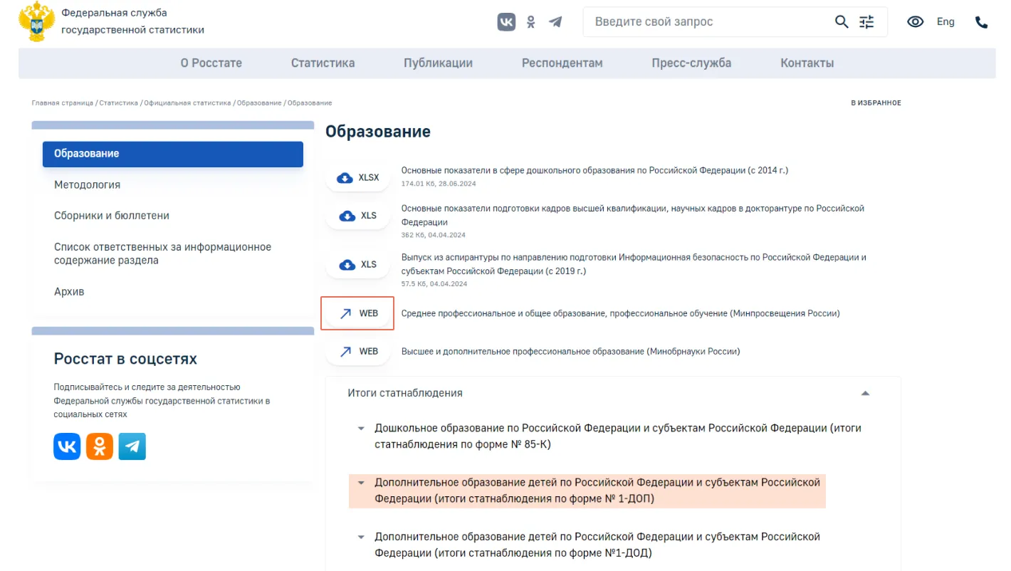 Многие ведомства сами публикуют собранные данные. Иногда этих данных нет ни на ЕМИСС, ни на Росстате. А иногда на сайте ведомства их просто проще найти. А иногда здесь лежат не отдельные показатели, а формы статнаблюдения целиком, как в предыдущем примере с формами Минпросвещения.