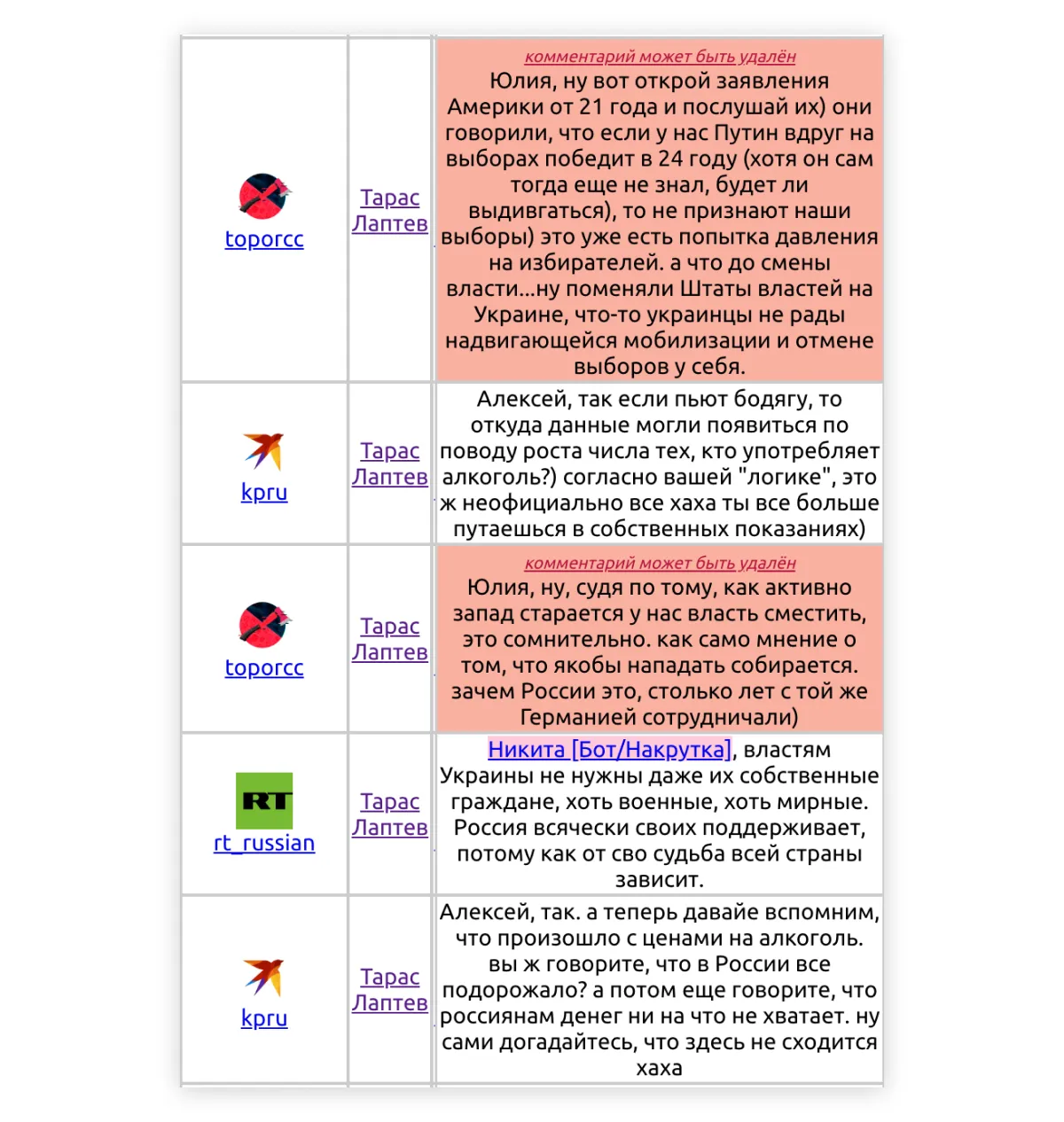 Приведем типичный пример работы одного из таких троллей, который комментировал упомянутые в тексте пропагандистские группы VK — аккаунт «Тарас Лаптев». После публикации расследования страничка была удалена, но вот подборка с примерами комментариев, который оставлял этот аккаунт.