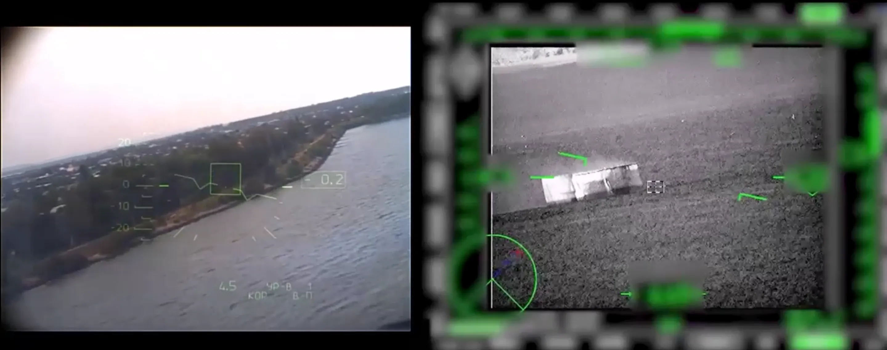 Баржа или опора моста. Таким же образом скачаем опубликованное в сентябре 2022 года видео «уничтожения морского десанта ВСУ в районе Запорожской АЭС» из официального телеграм-канала Минобороны на компьютер и сделаем стоп-кадр. Если на видео картинка размыта в движении, то здесь отчетливо виден ландшафт и цель, по которой наносится удар. Утверждение о том, что это «морской десант», вызывает явное сомнение, поскольку объект больше похож на некую капитальную постройку.