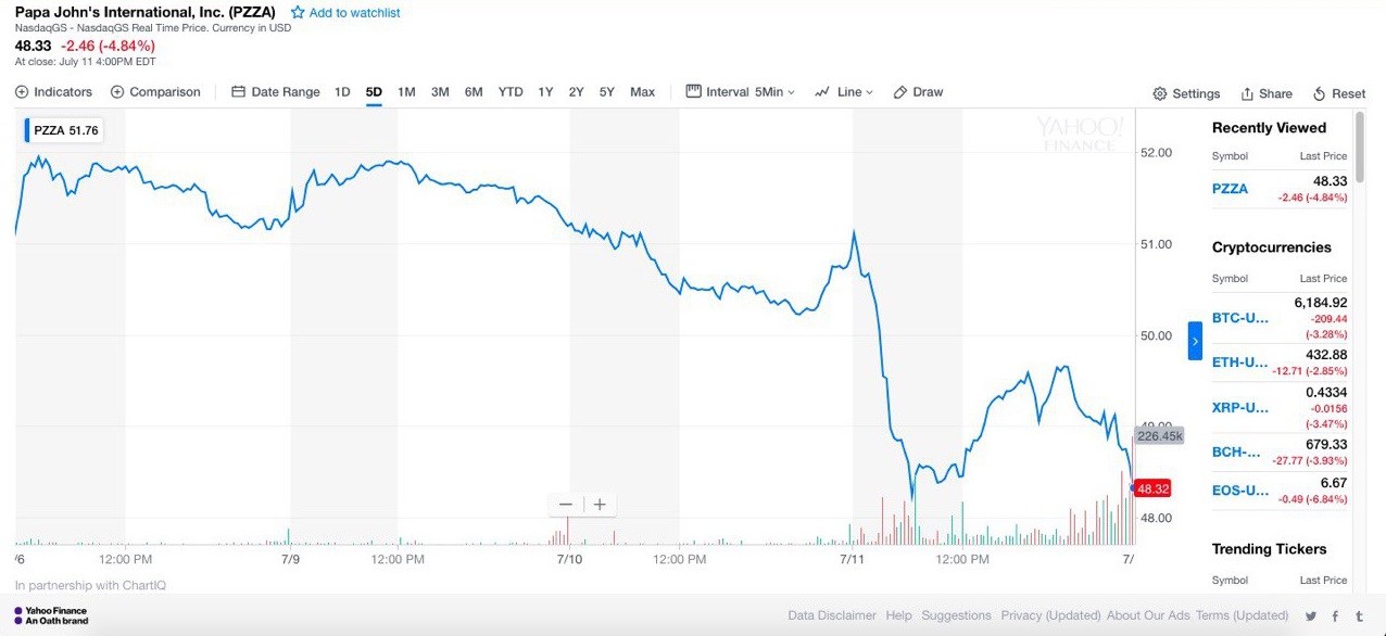 - Акции Papa John’s упали в среду на 4,8%, закрывшись на самом низком уровне с февраля 2016 года. С ноября прошлого года, когда Шнаттер позволил себе неосторожное высказывание в адрес НФЛ, капитализация компании снизилась на 30%.