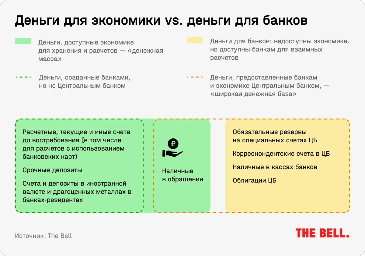 - Деньги ЦБ, они же деньги финансового сектора. Это деньги на корреспондентских счетах банков в ЦБ — то есть по сути обязательства центрального банка перед банковской системой. Они не попадают в экономику и не покидают системы взаиморасчетов между ЦБ и банками, которые он кредитует. Подробно об этой системе можно прочитать здесь.