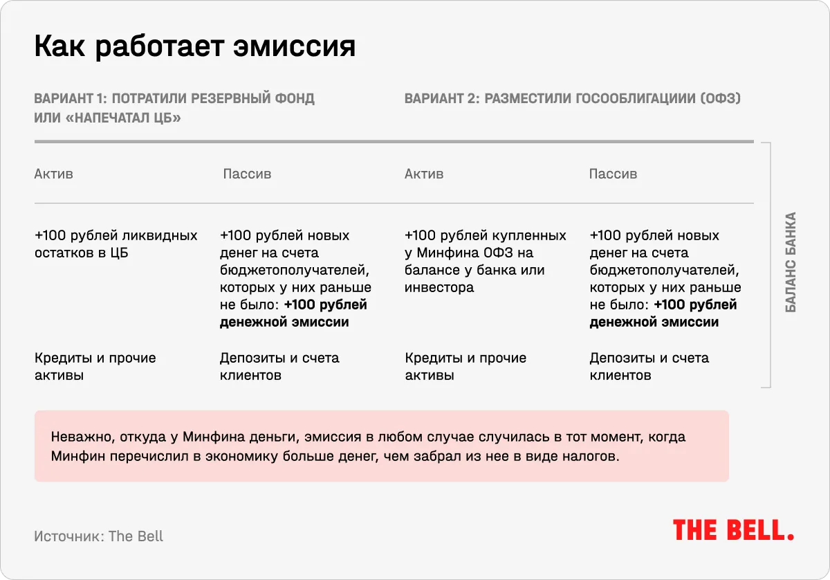 Значит ли это, что правительство перешло к печатанию денег? Формально да: количество денег в экономике благодаря действиям Минфина и ЦБ растет. Но «печатный станок» в привычном нам смысле при этом не включался, поскольку современная денежная система устроена немного иначе, чем мы привыкли думать.
