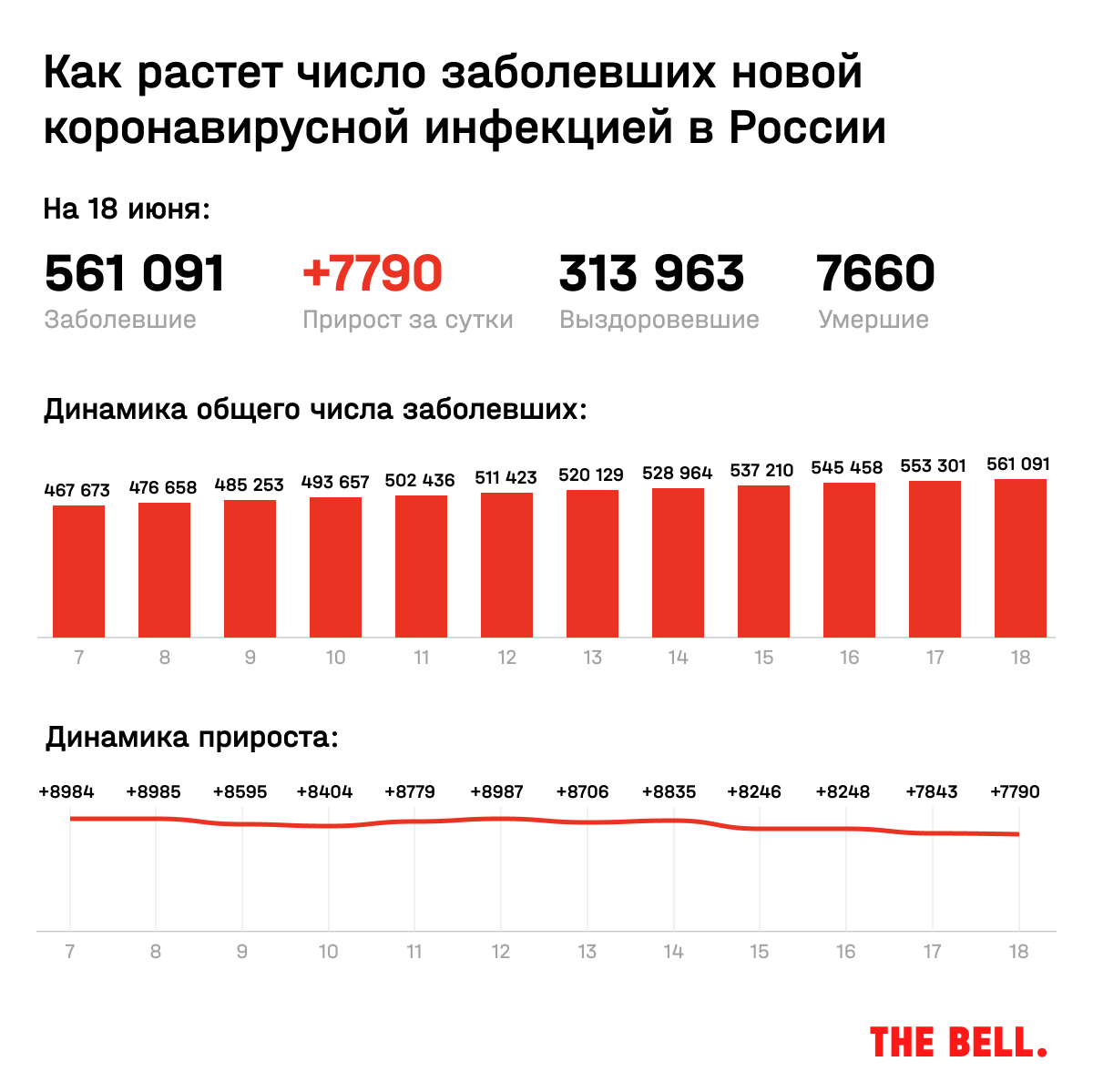 Сегодня второй день подряд, когда количество новых заболевших в стране меньше 8 тысяч — это уровень конца апреля. На Москву пришлось всего 13% новых случаев (1040), выздоровели в столице вдвое больше людей.