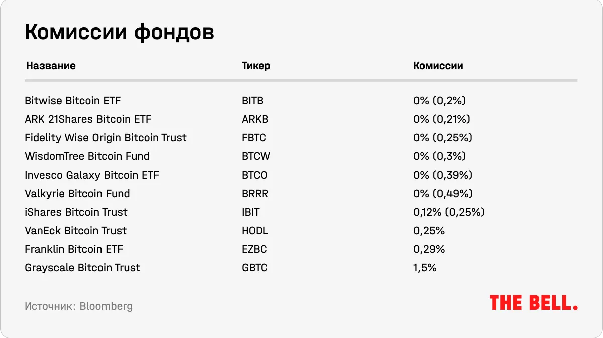 Один из важных факторов — более низкие комиссии. В ETF они будут варьироваться в размере от 0,2% до 1,5%. Для сравнения, на спредах и комиссиях Coinbase, по данным на третий квартал, зарабатывает 2,46% от сделки. При этом некоторые провайдеры ETF, в том числе BlackRock, Ark Investment Management и Invesco, уже объявили о планах полностью отказаться от комиссий на 6–12 месяцев, чтобы привлечь инвесторов (см. таблицу ниже). Однако фонды также зарабатывают и на спредах: анализ WSJ, проведенный днем в четверг, показал, что спреды разнятся от 2 центов у Bitwise до 58 центов у WisdomTree. C ростом объемов торгов ликвидность может вырасти, а спреды — снизиться, отмечает издание.
