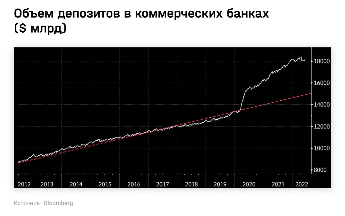 Собственно, это и произошло в пандемию: цунами налогово-бюджетных стимулов примерно в равном объеме сопровождалось покупками облигаций. Центробанки Великобритании, еврозоны и Японии вместе купили активов на сумму более $9 трлн. Результатом стал всплеск депозитов в коммерческих банках. В Америке они выросли с $13,5 трлн в начале 2020 года до $18 трлн к концу 2021-го. Как итог — резкий рост предложения денег.