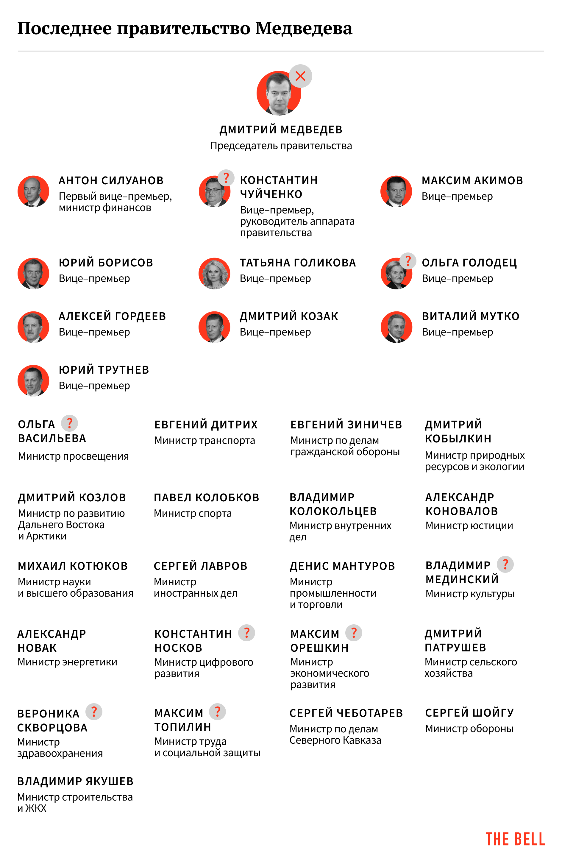 За что отставили Медведева. «Лицо у него было не особо счастливое, но списывать со счетов рано», — говорил The Bell в день отставки Медведева собеседник из числа крупнейших бизнесменов. «Еще не все потеряно, но потеряно многое», — добавлял источник, близкий к властным кругам. Источники Forbes называли причиной отставки Медведева провал в реализации нацпроектов и майского указа Путина. Источники «Открытых медиа» — наоборот, утверждали, что Медведев ушел сам, не согласившись с конституционной реформой и не добившись для себя введения должности вице-президента.