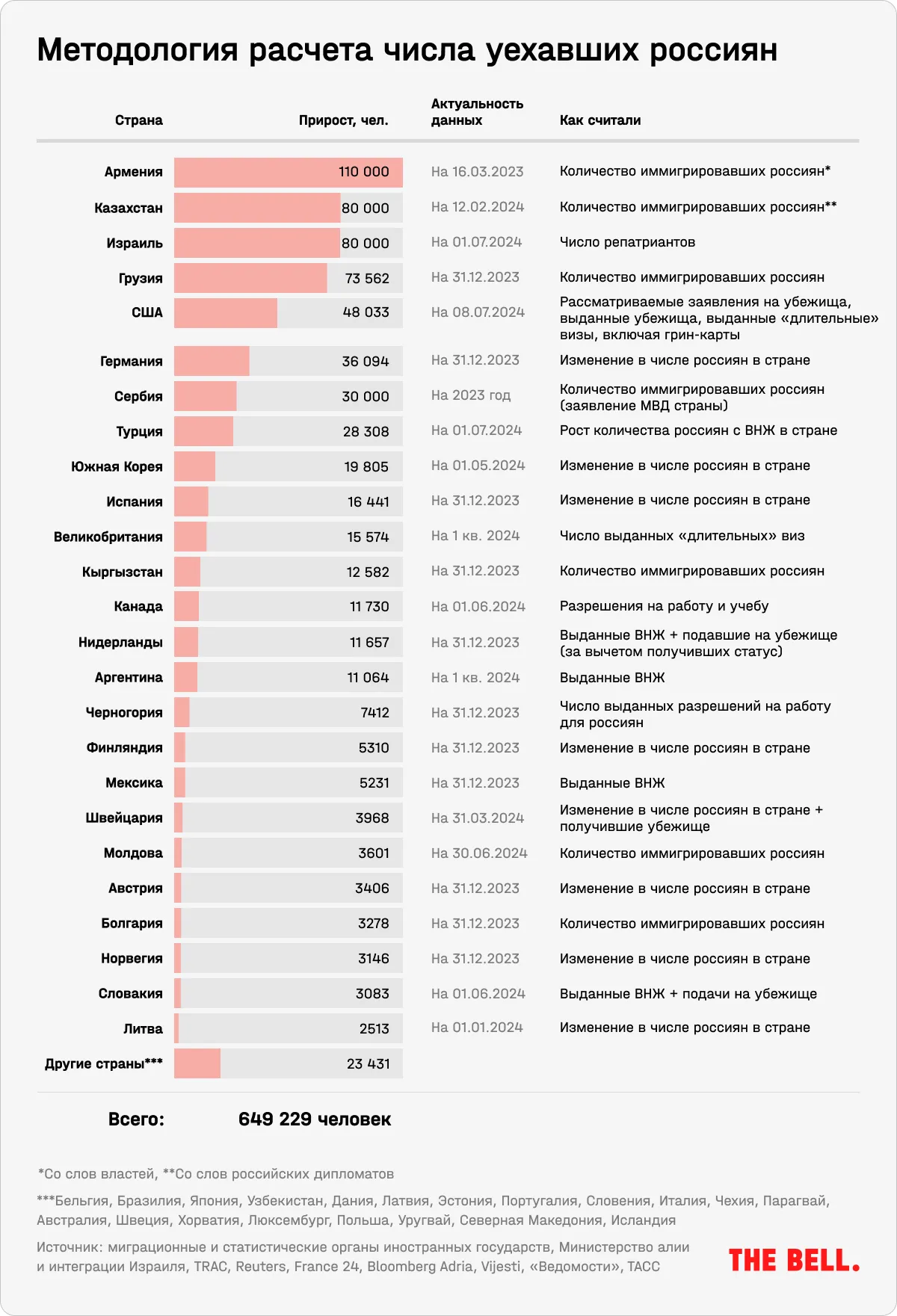 Для того чтобы точно определить, сколько россиян на самом деле решились эмигрировать, нам пришлось проанализировать статистические данные каждой из принимающих стран. Во многих случаях цифры за 2023 год, когда эмиграция еще продолжалась, были опубликованы только в этом году.