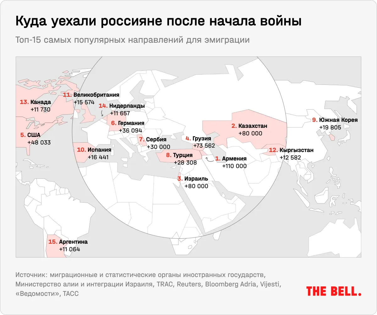 Среди стран-лидеров по числу переехавших туда россиян ожидаемо оказались безвизовые направления вроде Армении (110 тысяч человек), Казахстана (80 тысяч), Грузии (74 тысячи).