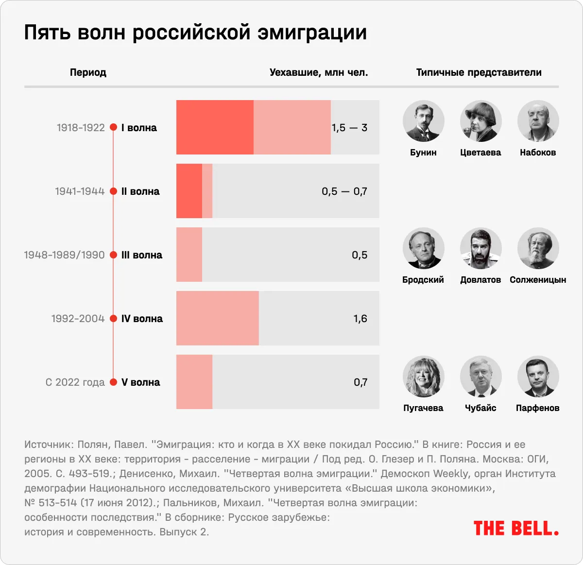 Несмотря на небольшую долю уехавших россиян относительно суммарного российского населения (всего 0,5%), массовая эмиграция россиян стала крупнейшей за последние 20 лет. До этого крупнейшей «волной» считался период с 1992 по 2004 год, когда страну покинули, согласно оценкам демографов, 1,6 млн человек.