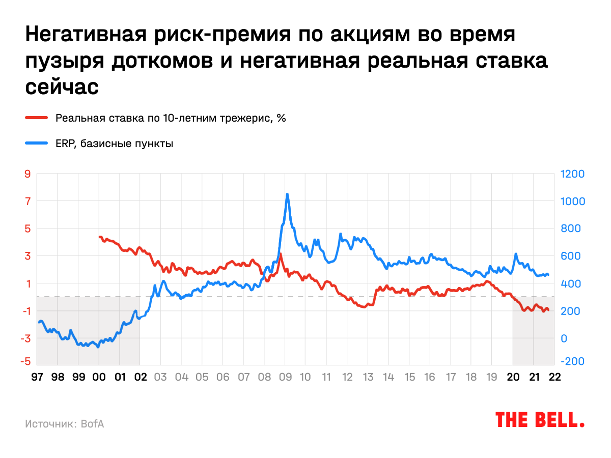 - Как и тогда, на рубеже 2021–2022 годов рынки принимают то, что в обычной ситуации сложно представить. Только перед пузырем доткомов это была отрицательная риск-премия (Equity Risk Premium, или ERP, — это премия, которую инвесторы требуют за вложения в рисковые активы (акции) по сравнению с безрисковыми), а сейчас это негативные реальные ставки. Это позволяет говорить о том, что сейчас пузырь находится не в акциях, а в облигациях, считают аналитики.