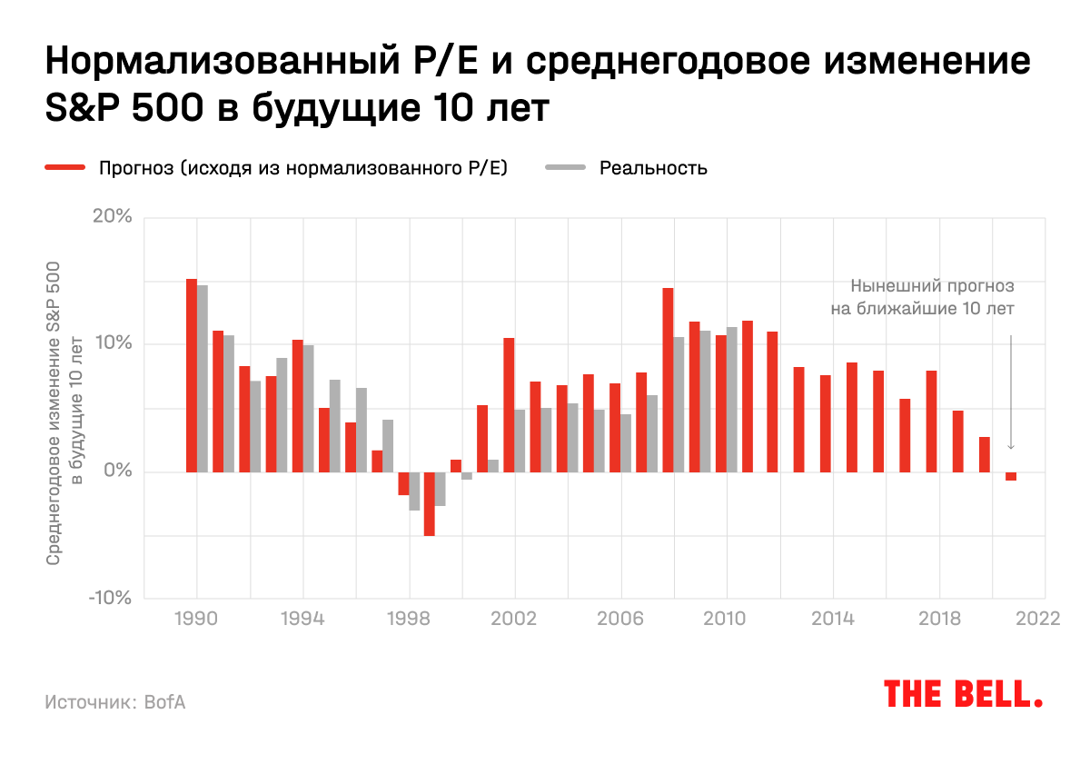 Впервые с пузыря доткомов нынешний уровень рынка указывает на то, что даже в долгосрочной перспективе инвесторам не стоит рассчитывать на рост рынков. Нормализованный P/E сейчас составляет 28x (против ~33x на пике пузыря доткомов). Исходя из этого значения, прогноз среднегодовой доходности в ближайшие 10 лет — минус 1,3%.