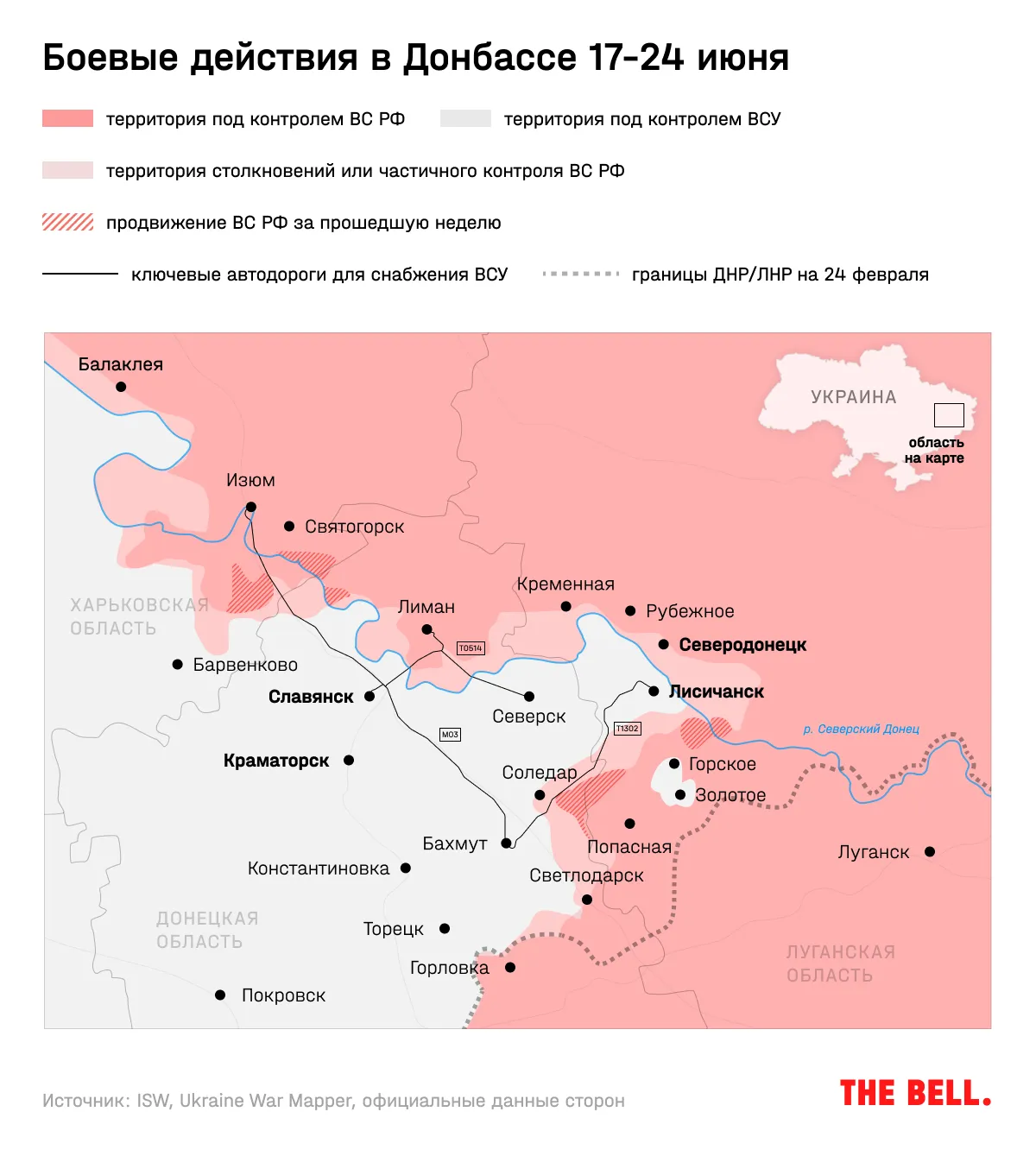 В трехмесячных позиционных боях вокруг Северодонецко-Лисичанского выступа наступил локальный перелом: российское Минобороны объявило о разгроме украинских войск в «котле»  к югу от Лисичанска и блокировании самого города. Украинские официальные лица заявили, что украинскую группировку удалось вывести из «котла» до его закрытия — но при этом признали, что начали отвод войск из административной столицы Луганской области, Северодонецка, бои в котором шли почти месяц. С потерей столицы украинской части Луганской области и вероятным взятием Лисичанска ВС России установят контроль над всей территорией области.