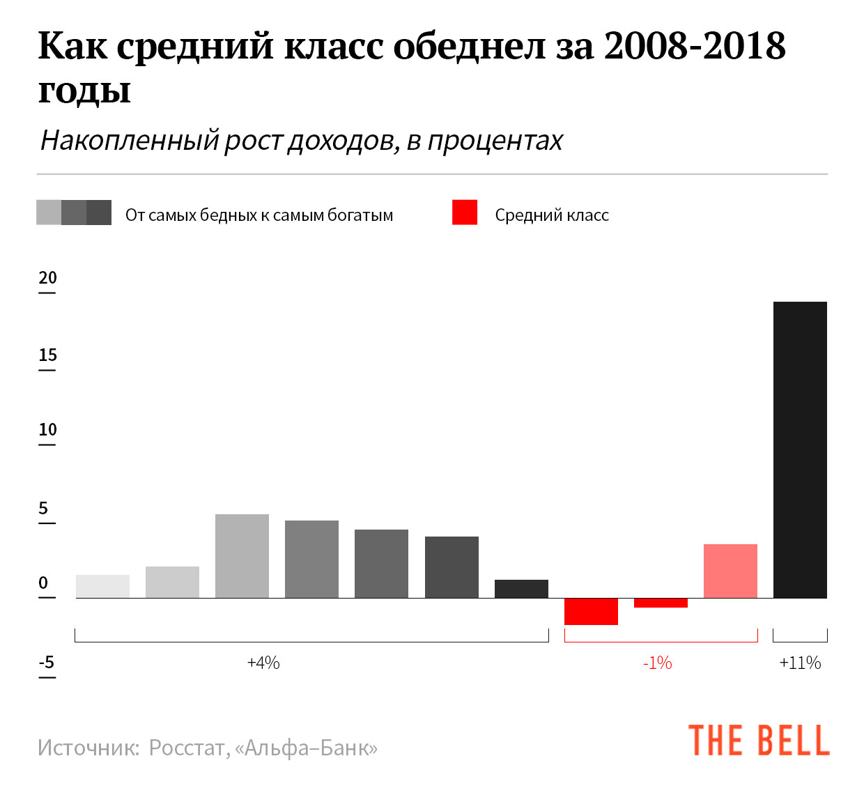 От замедления экономики и падения рубля пострадали все, но главной жертвой 2010-х стал российский средний класс. Больше всего пришлось ужаться самой состоятельной прослойке: людям, которые могут позволить себе товары длительного потребления вроде машин. Им сильнее прочих пришлось снизить расходы на отдых и развлечения, а также на здравоохранение и образование. Зато расходы на еду — выросли.
